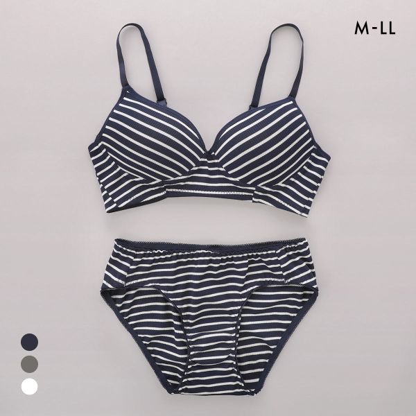 細幅のリブボーダーがカジュアル&ヘルシーなノンワイヤーブラセット。ストレッチのきいた生地を全体に使用しているので、着心地抜群でしめつけ感が少なくストレスを軽減してくれます。
