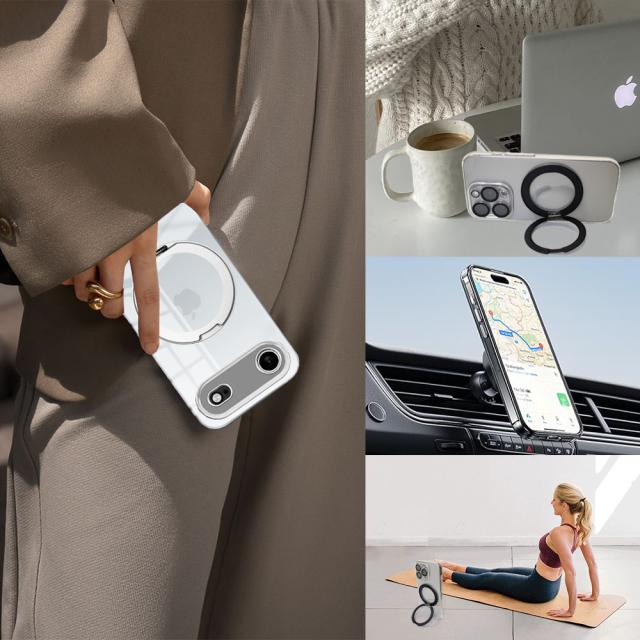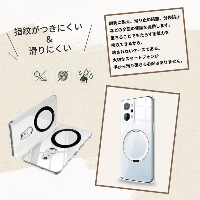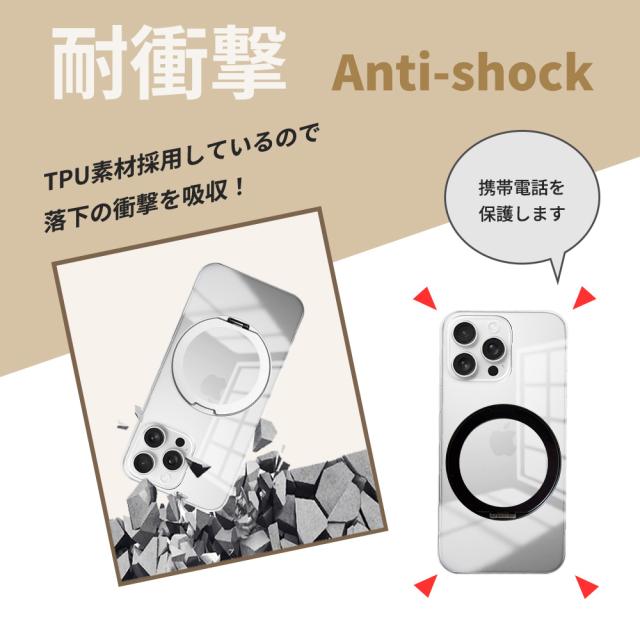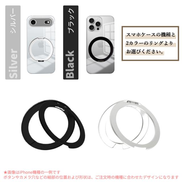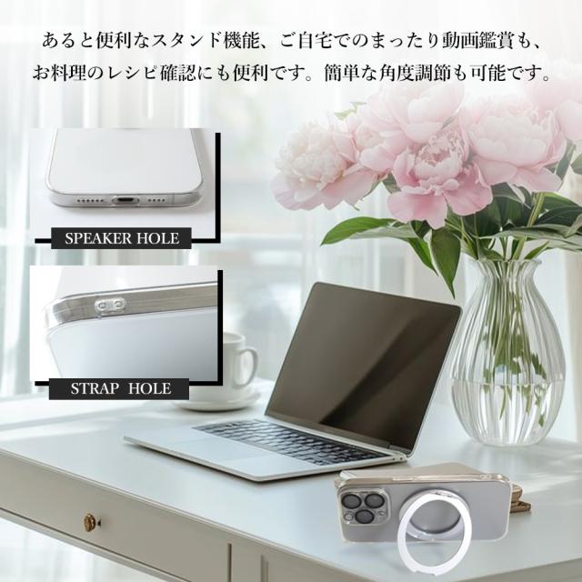 | 特徴 | ・「シンプルかつクリスタルクリア」 スマートフォン本体デザインを損なわず、美しさが際立つスーパークリスタルクリアタイプ。 ・カラー Magsafe対応リングは、鮮やかなメッキ仕上げの2色、お好きなカラーをお選びください!! ・360°回転式スタンド機能付き ケース一体型の収納スタンドは、 360°お好きな位置で停止して使用する事ができます。 収納時もケースにピタッと収まり邪魔になりません。 ・「優れた衝撃吸収性」 ・「適切なアクセスとワイヤレス充電対応」 | |||||
