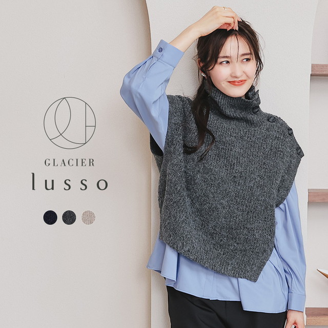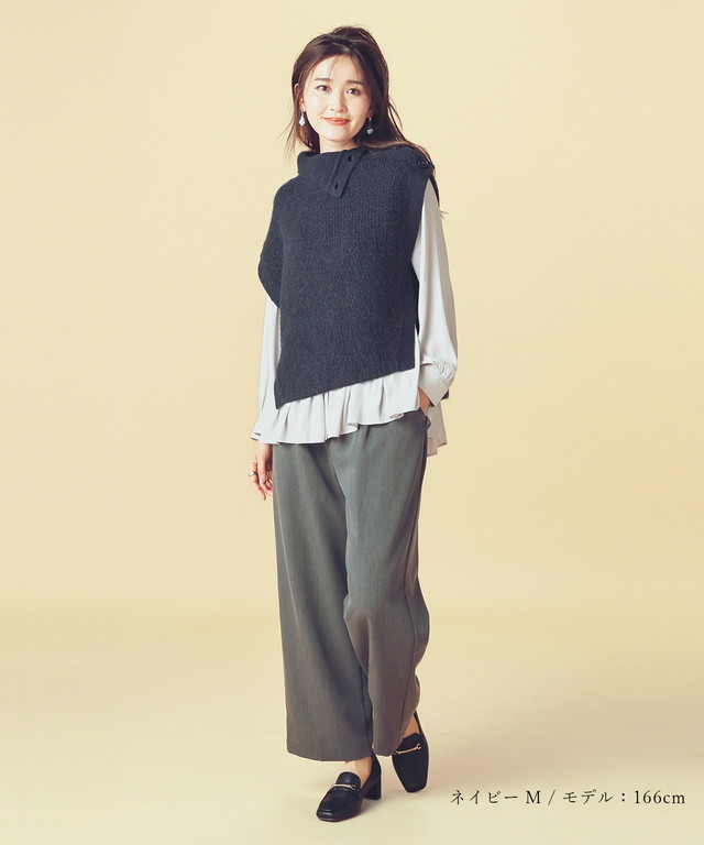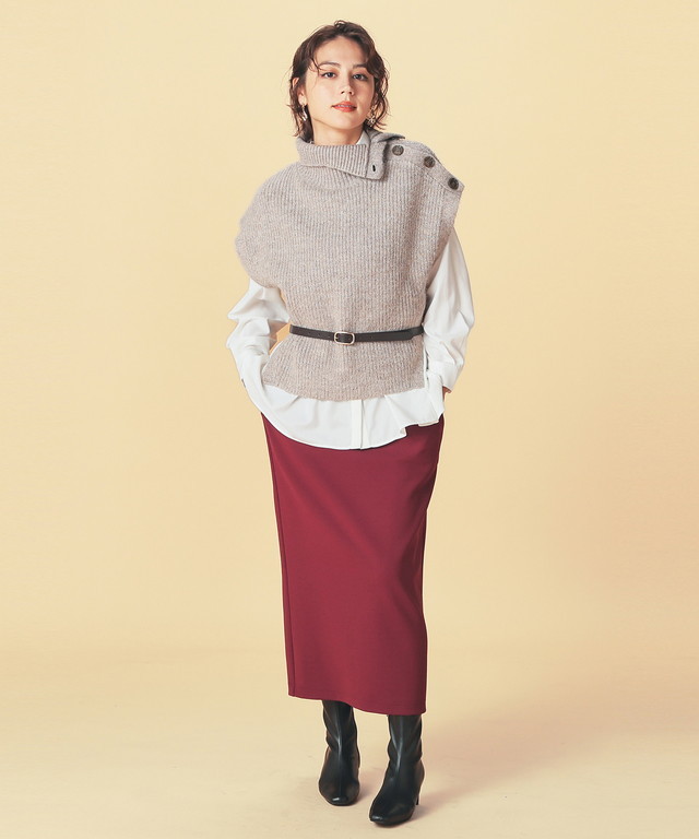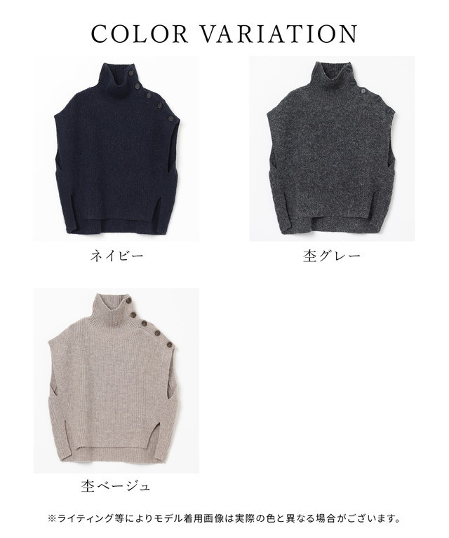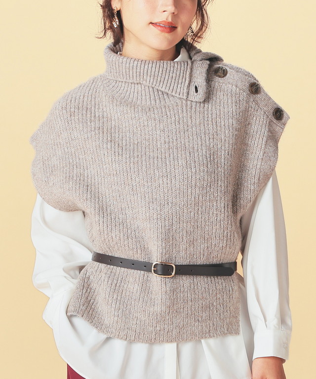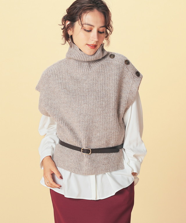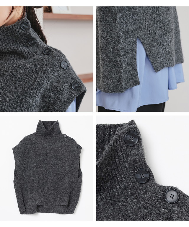 首元が暖かいハイネックに開け閉めできる肩ボタンをプラスした、着こなしのアレンジが楽しめるデザイン。