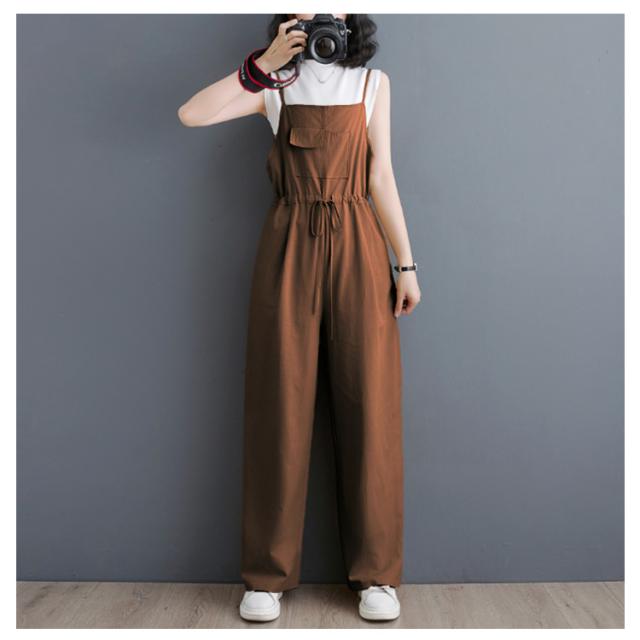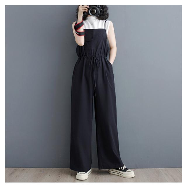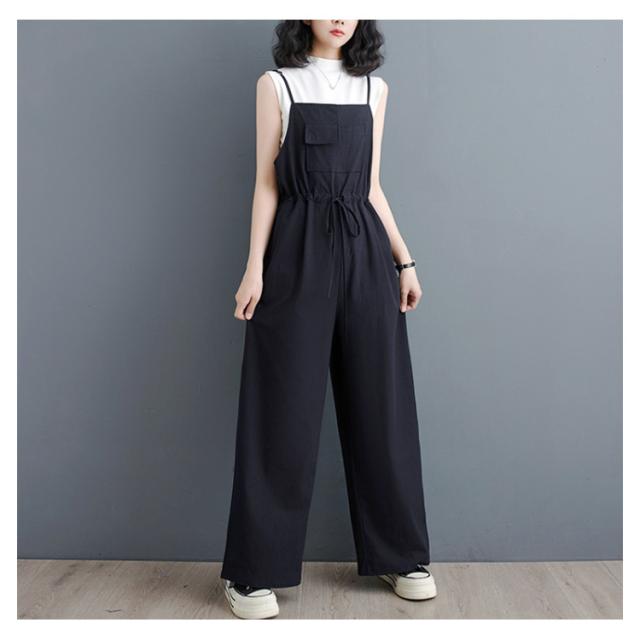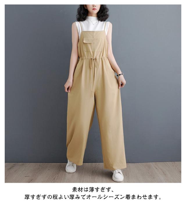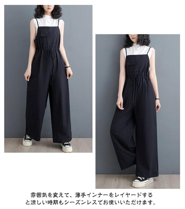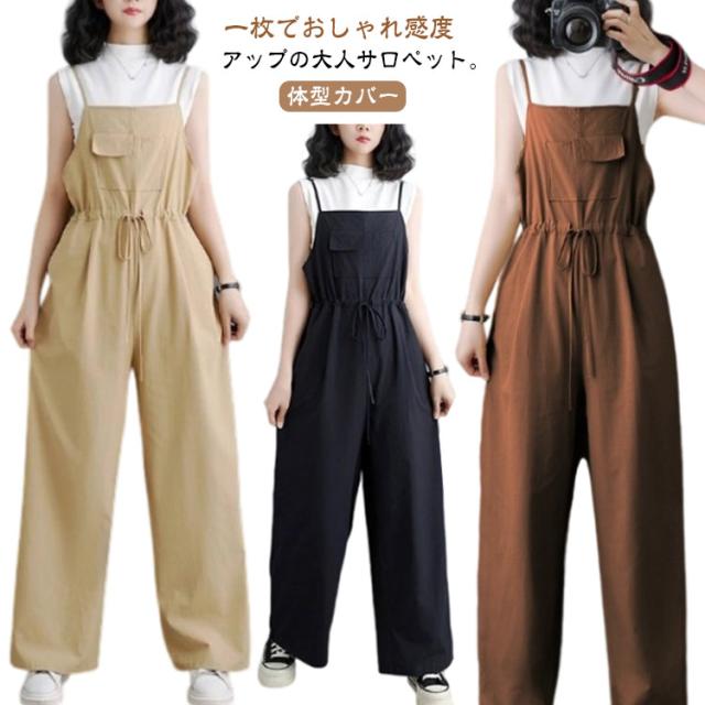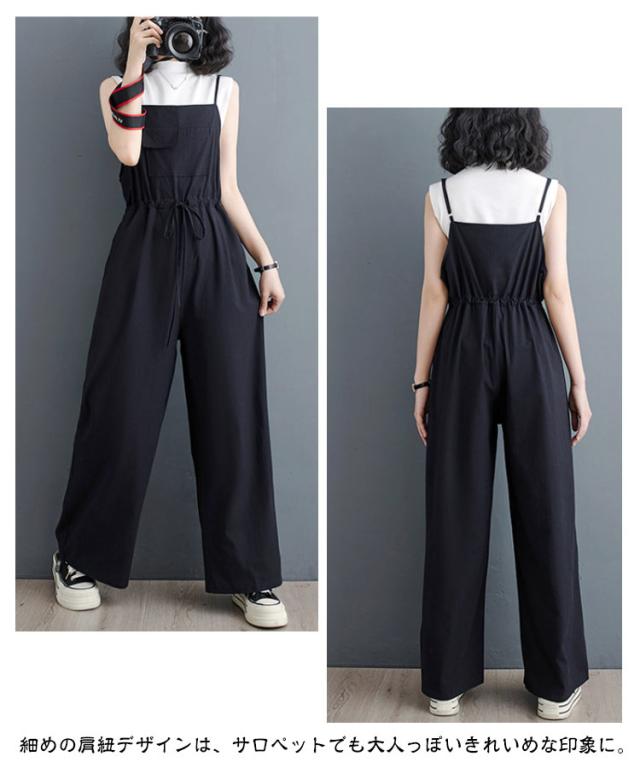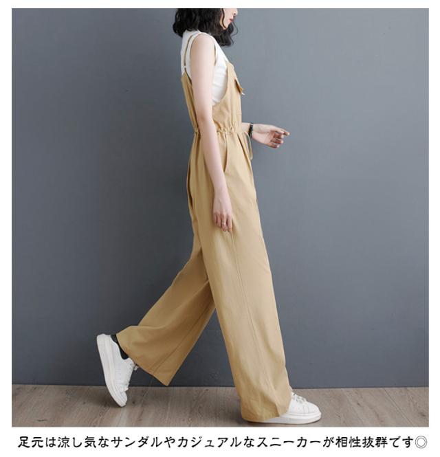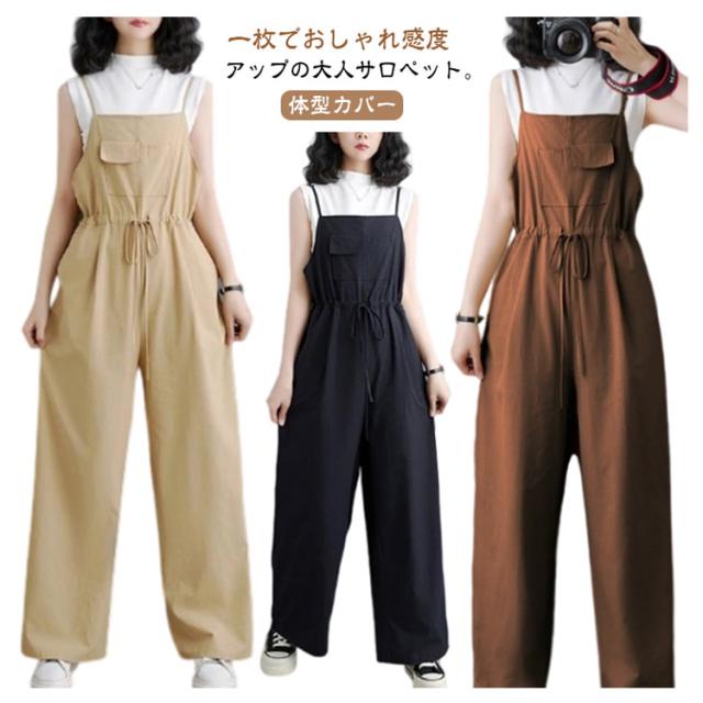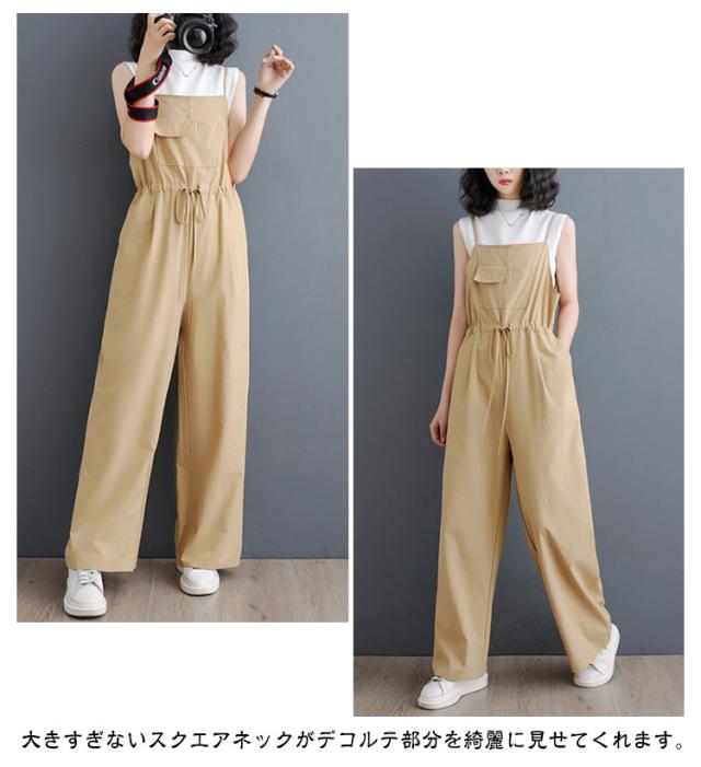 サロペットパンツ サロペット ワイドパンツ パンツ レディース ゆったり ワイド 九分丈 かわいい ウエストリボン スクエアネック オーバーオール 美脚 夏 春 サロペット 秋 通勤 通学 体型カバー 着痩せ