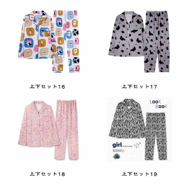 | 全20柄選べる! ルームウェア上下セットが新登場! 柔らかい生地は肌にやさしくて、 爽やかな着心地にうっとり、ほっとしたいオフの日は、リラックススタイルで過ごしましょう? パジャマはご自宅用としてはもちろん、 プレゼントとしても喜ばれます。 | |