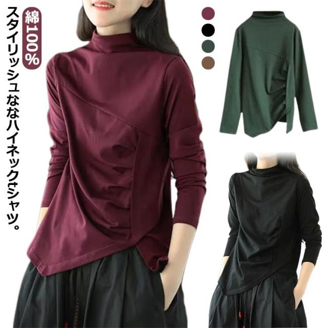 ハイネック 送料無料 綿100% 長袖tシャツ 秋 レディース カットソー コットン ハイネック 春 トップス タック ハイネックtシャツ タートルネック アシメトリー ナチュラル 無地 大きサイズ Tシャツ