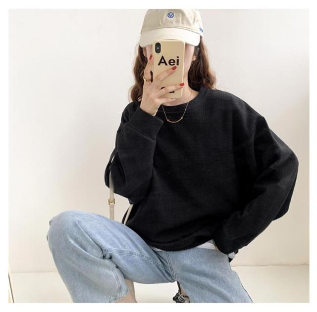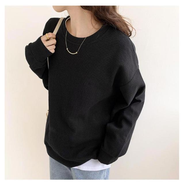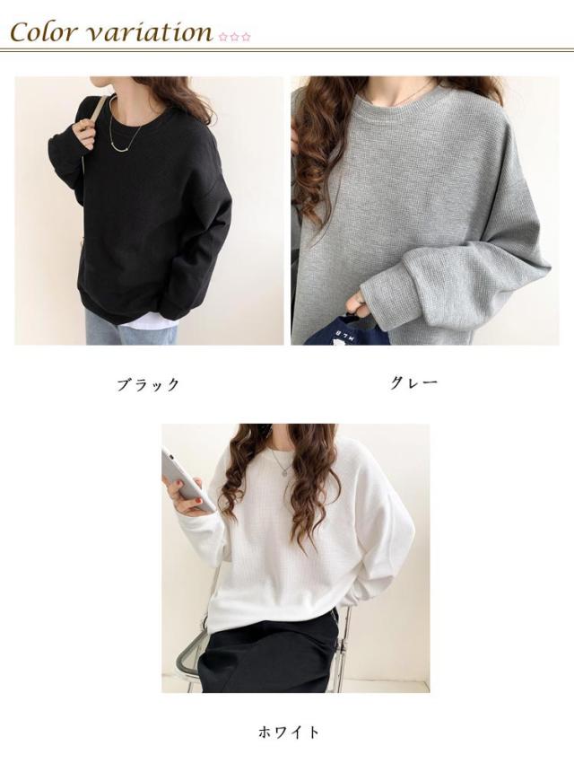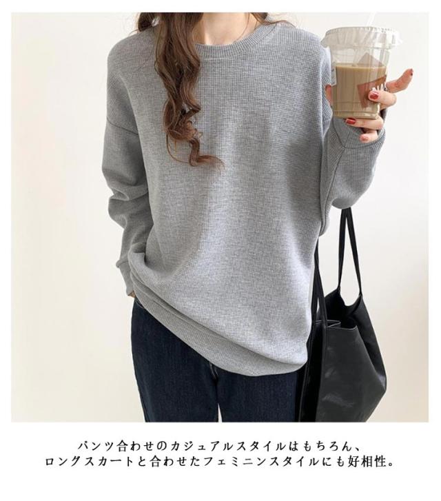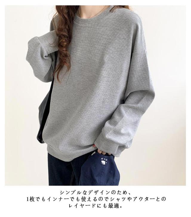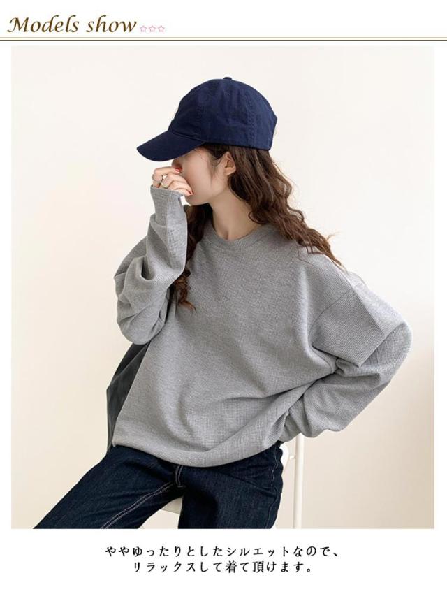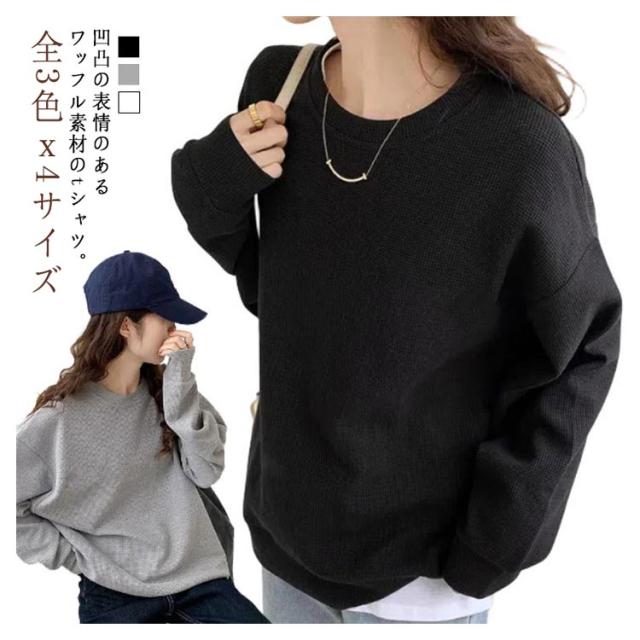 トレーナー Tシャツ ワッフル クルーネック ワッフル生地 ゆったり トップス 冬 レディース tシャツ 丸首 カットソー プルオーバー カジュアル シンプル プルオーバー ロンT ゆとめ ドロップショルダー 秋 無地 春 20代 30代 長袖