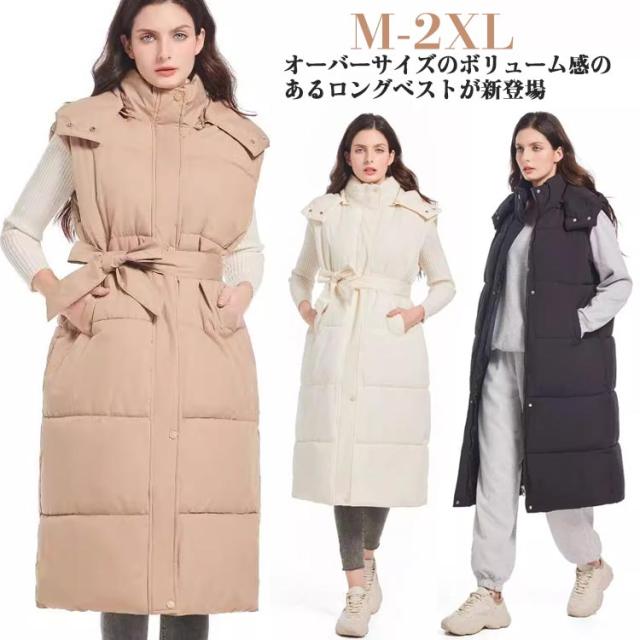 ベルト付き レディース ベスト 膝下丈 フード付き ファイバーダウン エコダウンベスト 無地 コート ロングベスト 中綿ベスト ノースリーブ エコダウンコート 秋 冬 アウター ベンチコート オーバーサイズ ロングベスト あったか 防寒 大人 カジュアル 通学 通勤