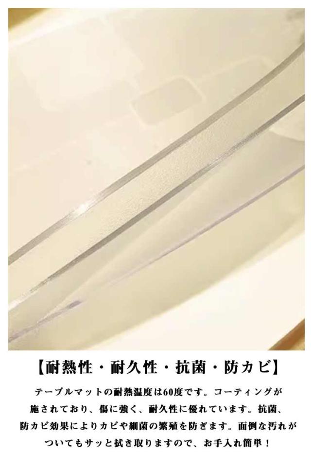 | 【PVC テーブルマット】:超高透明軟質PVC(塩化ビニール)を採用。ビニールの柔らかさはそのままに、傷・汚れがつきにくく変形しにくいといったメリットがあります。環境に優しく、健康なビニール材料、無臭!収縮しません!食品レベルPVC素材を採用し、こどもや老人が安心にご利用いただけ。安全安心で、食品と直接に接触することができます。厚さ:1.5mm、2mm、3mmあなたの好みに従って適切な厚さを選びなさい。 【撥水加工・清潔簡単】:透明なテーブルクロスはテーブルの元の色を維持し汚れやカビを防ぐ撥水加工でこぼしてもサッと拭くだけで清潔できます!PVC透明テーブルクロス、防水、耐油性、耐熱性。 【透明度が高く、高機能性、安全安心】:透明なのでテーブルの見た目を変えることなくキズ・汚れから保護できます。防水、耐油性、耐熱性、高温耐性、清掃が簡単透明なテーブルクロス。適度な厚みで、テーブルクロス以外にチェアマットとしてもご利用いただけます。 【テーブルクロス多機能】:シンプルで上品のデザインで、テーブルクロス、テーブルマット、デスクマット、デスク、テーブル、学生デスク、学習机、ティーテーブル、ポーカー、アスレチックスなどに使用できます。 【耐熱性・耐久性・抗菌・防カビ】:テーブルマットの耐熱温度は60度です。コーティングが施されており、傷に強く、耐久性に優れています。抗菌、防カビ効果によりカビや細菌の繁殖を防ぎます。面倒な汚れがついてもサッと拭き取りますので、お手入れ簡単! | |