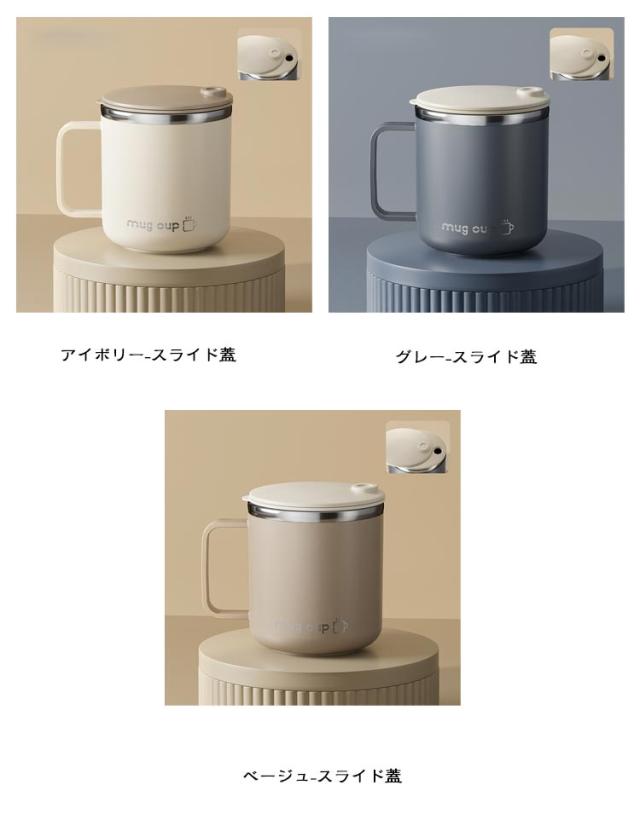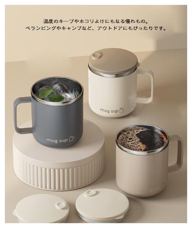 | 【蓋つきステンレスマグ】 スライド式飲み口がついたフタ付きのマグカップ。 保温・保冷に優れたステンレス製真空二重構造で、飲み物の適温を保ちます。 フタ付きで中身がこぼれにくく、オフィスや寝室でも活躍。 落としても割れにくいステンレス製のマグのころんと丸いフォルムは包み込むように手にフィット。 温度のキープやホコリよけにもなる優れもの。 べランピングやキャンプなど、アウトドアにもぴったりです。 | |