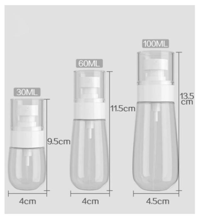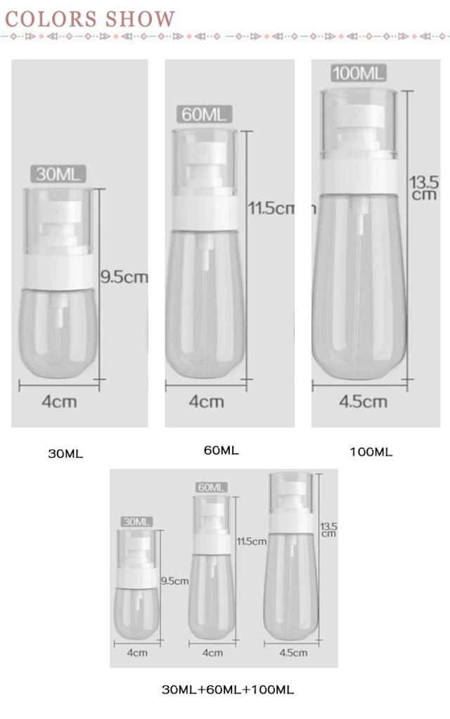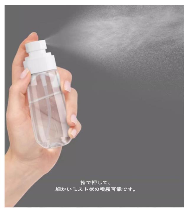 | 3個セット!各種の液体を入れることができます。 例えばアルコール、消毒の洗剤、洗剤、化粧水 、(髪の毛、ペット、園芸)の噴霧剤など に適用します。 指で押して、細かいミスト状の噴霧可能です。 コンパクトで持ち運び便利! 旅行、遠足またお出かける時にアルコールや洗浄液の持ち出しに適用です | |
