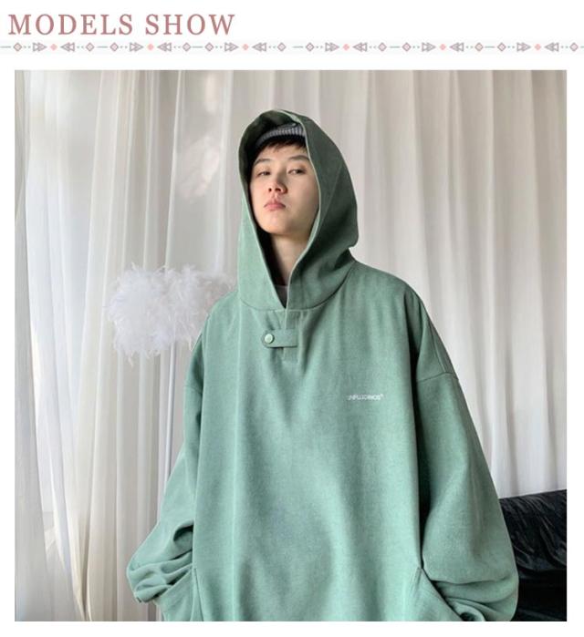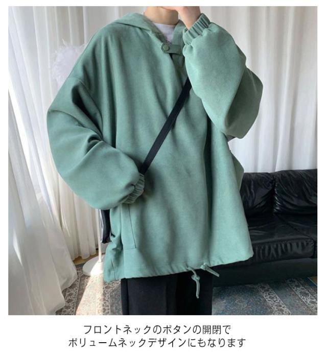 | シンプルなデザインなので、コーデのアレンジが効くのが魅力です。 生地は薄すぎず厚すぎない適度なスウェット地で秋・冬・春と長いシーズンご着用いただけます フロントネックのボタンの開閉でボリュームネックデザインにもなります ビックシルエットなので1枚着でも現代的な韓国ファッションを演出してくれます | |