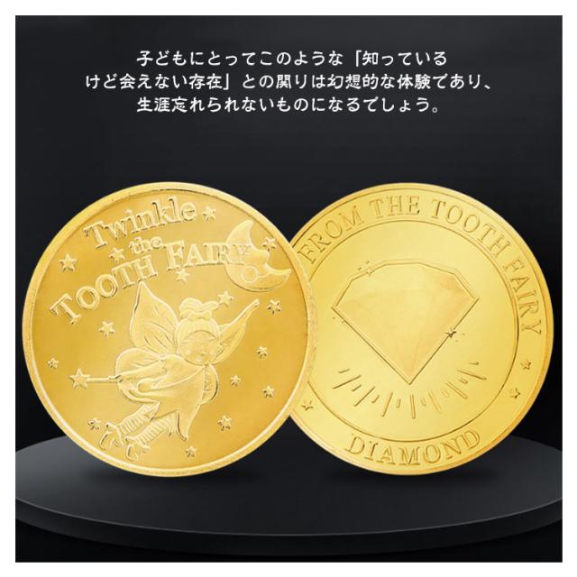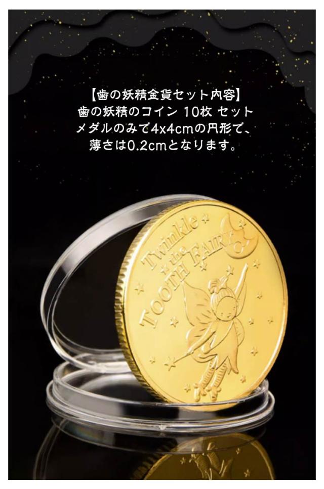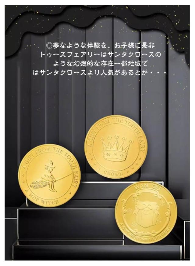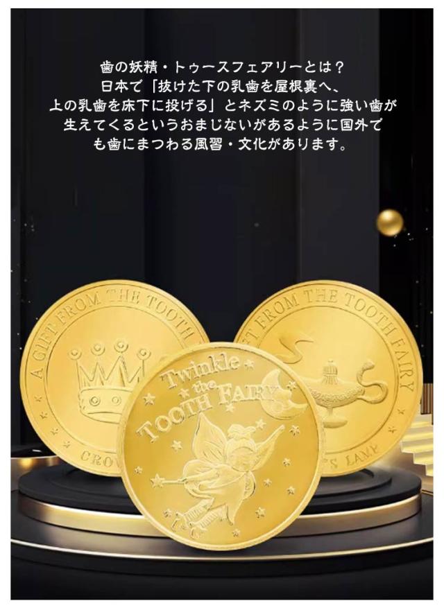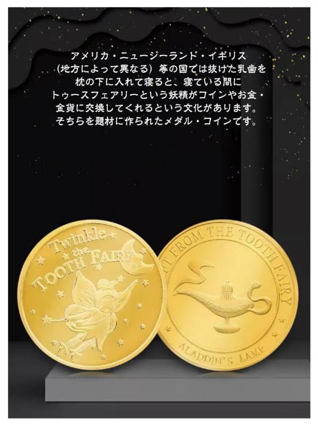 | 歯の妖精コイン 10種類 【10個セット】 【歯の妖精金貨セット内容】 歯の妖精のコイン 10枚 セット メダルのみで4x4cmの円形で、薄さは0.2cmとなります。 歯の妖精・トゥースフェアリーとは? 日本で「抜けた下の乳歯を屋根裏へ、上の乳歯を床下に投げる」とネズミのように強い歯が生えてくるというおまじないがあるように国外でも歯にまつわる風習・文化があります。 アメリカ・ニュージーランド・イギリス(地方によって異なる)等の国では抜けた乳歯を枕の下に入れて寝ると、寝ている間にトゥースフェアリーという妖精がコインやお金・金貨に交換してくれるという文化があります。 そちらを題材に作られたメダル・コインです。 乳歯と交換コインの他にも、記念コイン、コインコレクション、こどものおもちゃとしてのプレゼント(おままごとや発掘金貨体験など)、乳歯ケースと一緒に入れる記念としてなど、色々お使い頂けます。 ◎夢なような体験を、お子様に是非 トゥースフェアリーはサンタクロースのような幻想的な存在一部地域ではサンタクロースより人気があるとか・・・ 子どもにとってこのような「知っているけど会えない存在」との関りは幻想的な体験であり、生涯忘れられないものになるでしょう。 想像力・好奇心を刺激してあげることで知育的な効果もありお子様のドキドキ・ワクワクとともに好奇心・想像力を刺激してあげましょう! | |