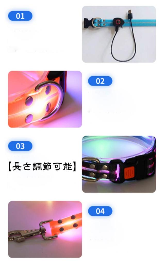 | LEDペット用リードセット (首輪+リード2点セット) 【高い可視性】光るリードセットは高輝度LEDを採用、近くても遠くても鮮明的に光を放ち、視認することができます。ペットとの夜間散歩もリラックスで安心に行けます。 【長さ調節可能】 首輪最大55cmまで、結び目で調整し、愛犬に合わせる長さにすることができ、痛くならないように肌と首を守ってあげます。使わない時、巻いてバッグに入れられ、収納・持ち運び便利です。 【8時間持続時間】 1時間でフルに充電して8時間持続的に光れます。ペットライトは3つの点灯モードをスイッチ操作で簡単に切り替え可能です:定常照明、高速点滅、低速点滅。 【雨の日でも安心】 防水性良いPVCコーティングテープで作られた首輪です。雨の日も楽々にお使い頂けます。※生活防水レベルです。お風呂やプールには入れないでください。 | |