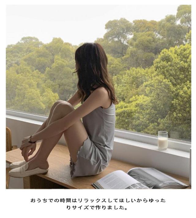 | タンクトップ・ショートパンツの2点セットです。 さらっとした素材で着心地快適なルームウェア。 パジャマ・寝間着・ナイトウェアとしてはもちろん、お休み前や部屋着にもぴったり! おうちでの時間はリラックスしてほしいからゆったりサイズで作りました。 自宅用パジャマとしてだけでなく、旅行、出張、宿泊、入院などする際のパジャマとしてもご着用いただけます。持ち運ぶ際は、襟以下の部分を折りたたんでコンパクトに収納できるため、一時的な着用にも適しています。普段のルームウェアとしての用途以外にもおすすめです! | |