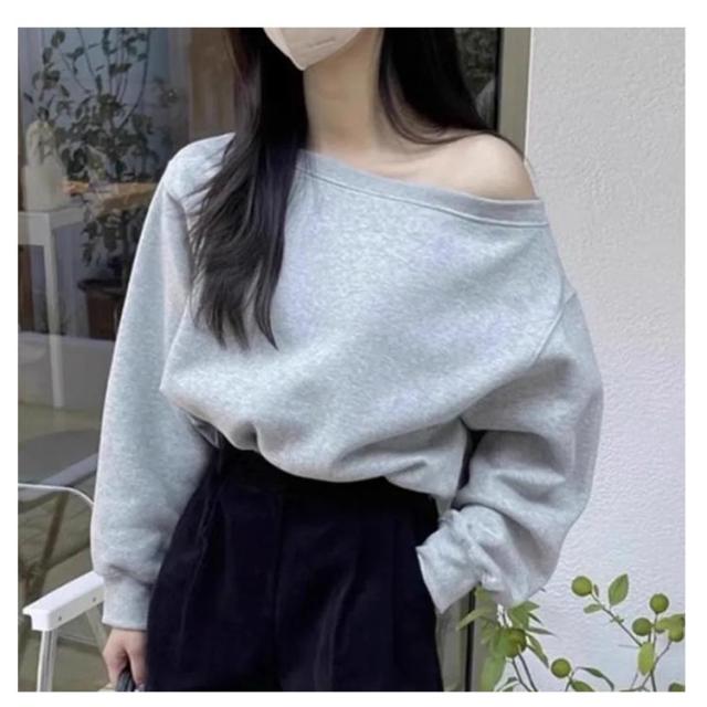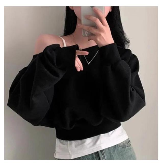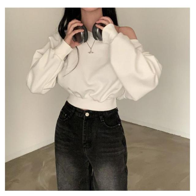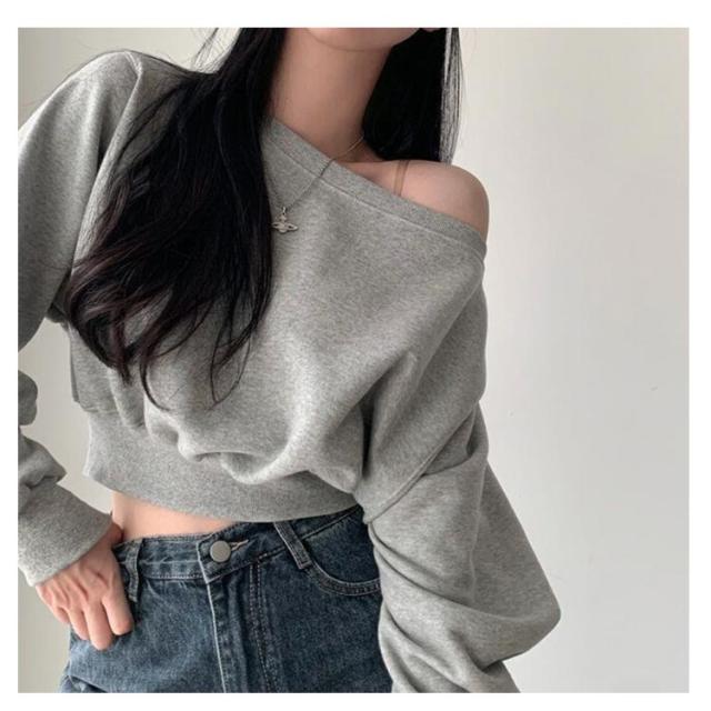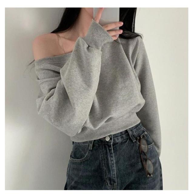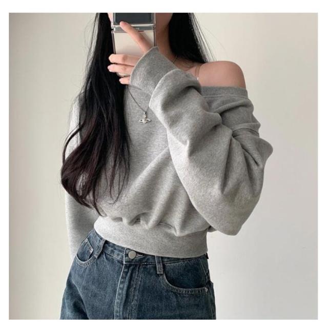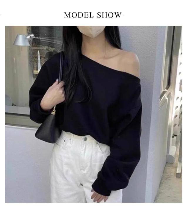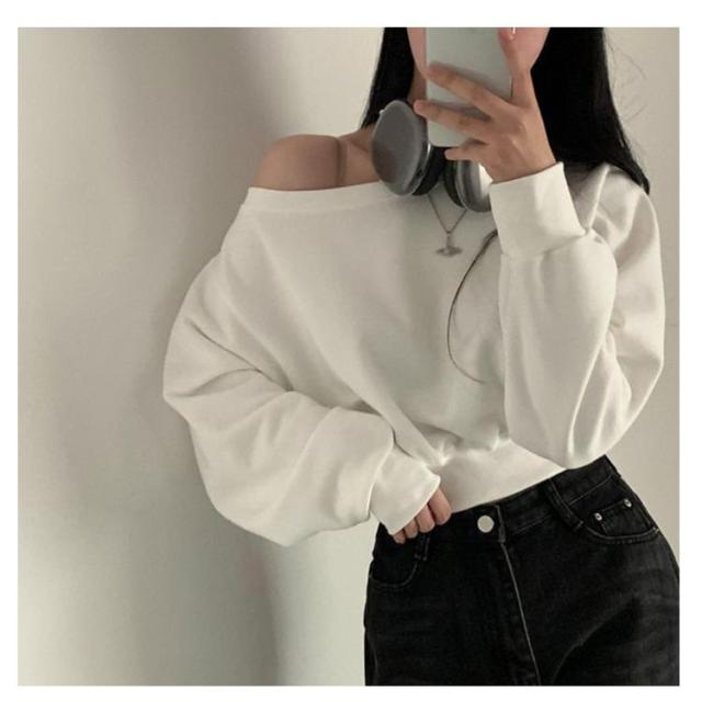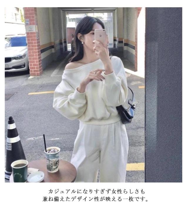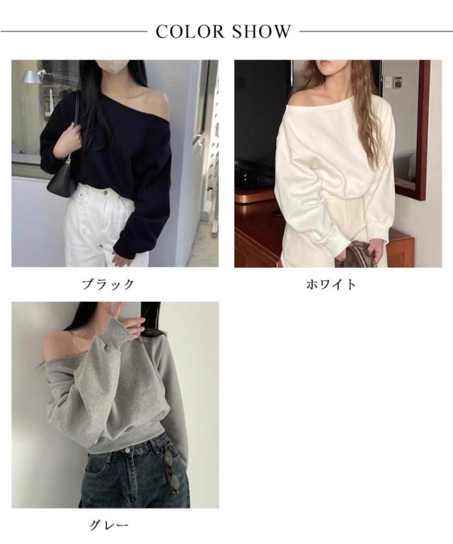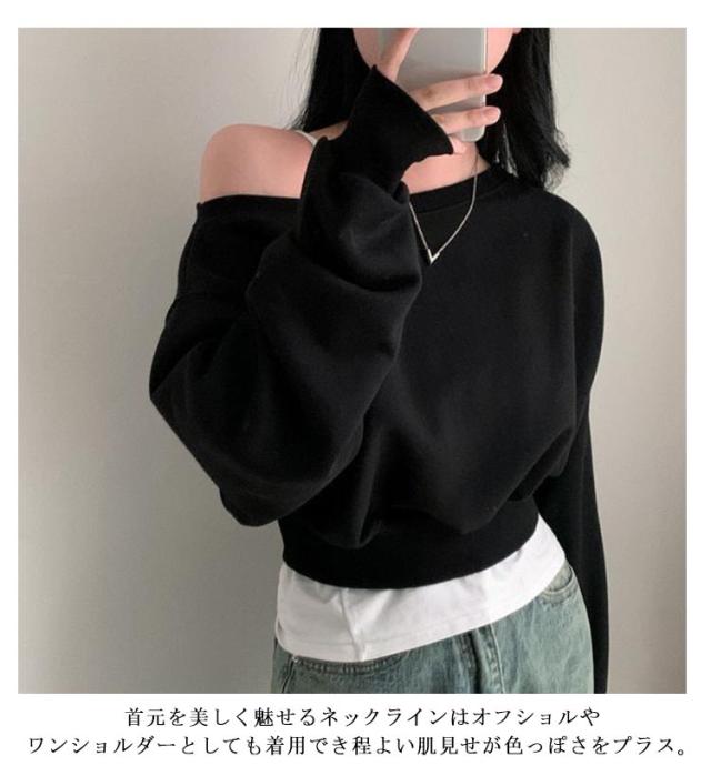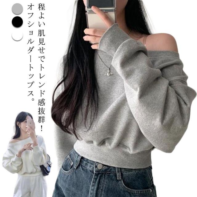 春秋 トレーナー Tシャツ オフショルダー スウェット ラウンドネック レディース 長袖 トップス カットソー バルーンスリーブ プルオーバー ゆったり オフショルダー 無地 可愛い 韓国ファッション