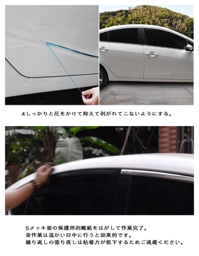 | 【車用メッキテープ】 幅6mm/8mm/10mm/12mm/15mm/18mm/20mm/25mm/30mm 【長さ5M 3M】 【 愛車のドレスアップに♪ 】 車のカスタマイズパーツのメッキモールは、主に外装に取り付ける事で高級感のある印象に愛車をドレスアップしてくれます。シルバーのシンプルなデザインで、様々な色や形の車にも相性が良く馴染みやすくなっております。さらに擦れやすい場所の傷つき防止や、隙間隠しなどの役割も可能です。粘着テープで貼るだけのお手軽作業でドレスアップしていただけるため、初心者の方でも安心してご利用頂けます。 【 自由自在にフィット! 】 PVC素材で柔軟性に優れており、平面でも曲面でもフィットするため自由自在にドレスアップしていただけます。また、幅と長さが異なる11種類のタイプをご用意しております。長さはハサミ等で調節していただけるため、幅広く様々シーンで活躍します。お好みに合わせて11種類の中からお選びください。水にも強いため、雨の日や洗車の際も安心してご利用頂けます。 【 取り付け方法 】 本製品の取り付け方法は次の通りです。1貼り付ける場所の汚れや油分をしっかりと拭き取り取り除く。3貼り付け場所に合わせてカットする。3粘着テープのシールを剥がし、ズレないようにゆっくりと貼り付ける。4しっかりと圧をかけて抑えて剥がれてこないようにする。5メッキ面の保護用剥離紙をはがして作業完了。※作業は温かい日中に行うと効果的です。繰り返しの張り直しは粘着力が低下するためご遠慮ください。 【 様々なシーンで活躍します♪ 】 本製品は、内装や窓、ミラー、バンパーなど外装のワンポイントなど様々なシーンで活躍するアイテムです。貼るだけのお手軽作業ですのでぜひご活用ください。 | |