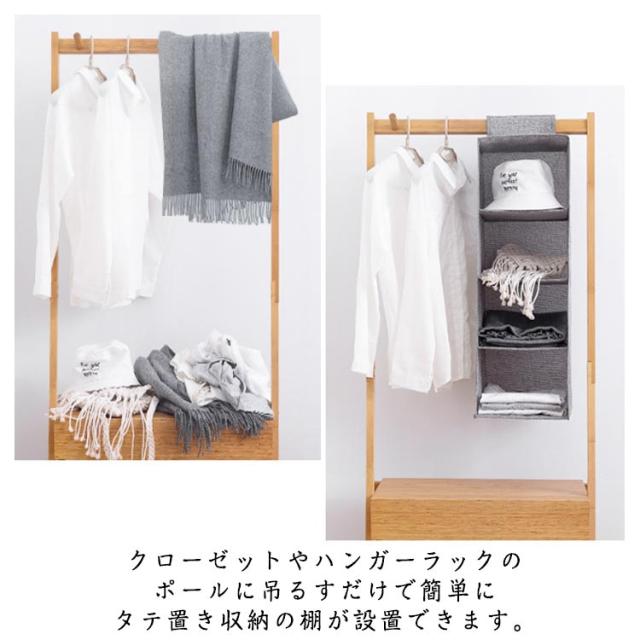 | クローゼットやハンガーラックのポールに吊るすだけで簡単にタテ置き収納の棚が設置できます。 棚置き式で、出し入れが簡単にでき、シャツやセーター、帽子などの気になる型くずれを防いで収納できます。 ポールに巻き付けるだけで簡単に取り付けOK! 通気性が良い不織布製なので、カビがつきにくく、やわらかい生地でやさしく保管できます。 使わない時は、折りたたんでおけば、かさばらすに省スペースで保管ができます。 | |
