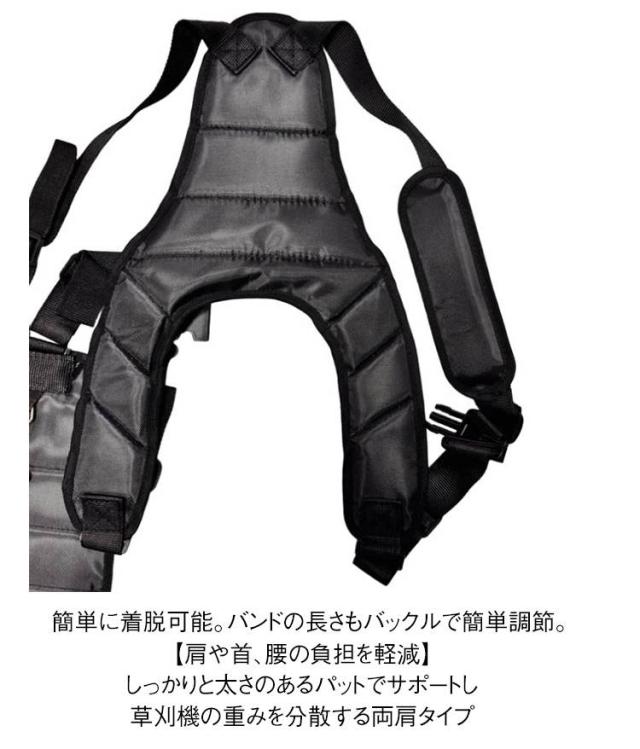 | 草刈り機・刈払い機専用の肩掛けベルト。 首から下げるタイプではなく、両肩掛けなので長時間作業が可能。 分厚い肩パッド・背中パッド・腰パッドが負担を軽減し、安全で快適な付け心地を保証。 簡単に着脱可能。バンドの長さもバックルで簡単調節。 【肩や首、腰の負担を軽減】 しっかりと太さのあるパットでサポートし 草刈機の重みを分散する両肩タイプ 【腰パット付きで痛みを防ぎ、作業効率アップ】 長さのある腰パットがエンジンの振動や熱からガード 硬さがあり、骨に直接当たらないので腰骨の痛みを防ぐ 【調整ベルトでぴったりサイズに】 複数のベルトでサイズを調整できるので 性別や体型にかかわらず体にフィット 【ハードな外作業に耐えるしっかり品質】 ・耐久性、耐摩耗性のある生地 ・草刈機の重さに耐える縫製 ・装着はバックル式で簡単 | |