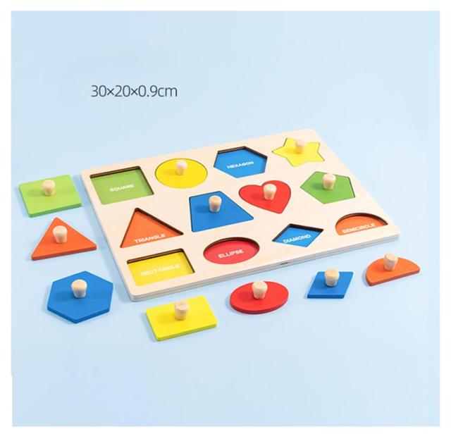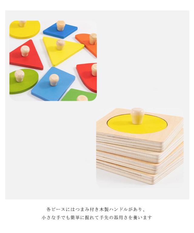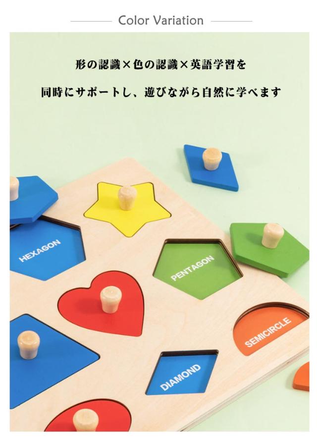 | 木製 型はめパズル 遊びながら楽しく学べる知育パズル 安全な木製素材を使用し、表面は滑らかに加工されているので小さなお子さまも安心。 形の認識×色の認識×英語学習を同時にサポートし、遊びながら自然に学べます。 各ピースにはつまみ付き木製ハンドルがあり、小さな手でも簡単に握れて手先の器用さを養います。 幼児の知育にぴったり! | |