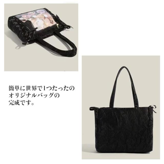 | レースアップのデザインが可愛いトートタイプの痛バックです! 推しの写真、缶バッジ、ストラップなどを入れて自分の好みの痛バにアレンジしてください♪ 前の透明カバーに飾り板が入っていて、自分の好きな小物を入れることができるトートバッグです。 好きな芸能人や、アニメの写真 、缶バッジ、ストラップ、ぬいぐるみ、キーホルダーなどを入れるだけで、 簡単に世界で1つたったのオリジナルバッグの完成です。 A4大容量!見た目以上の収納力、しっかり収納できる。A4雑誌、ipad、教科書、手帳、ファイル、スマホ、傘、化粧品、財布などを入れます。 | |