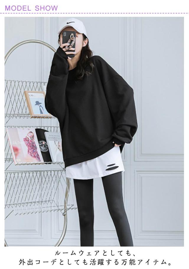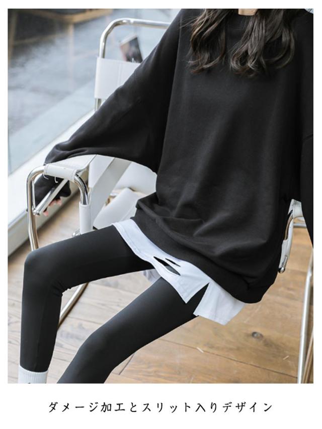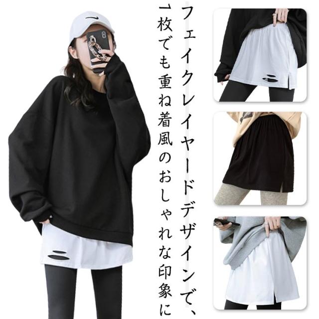 大きめサイズ 秋 フェイクレイヤード レディース ブラック Tシャツ 夏 冬 インナー 無地 フェイクレイヤード ホワイト ストリート ゆったり 体型カバー レイヤード 重ね着風 カジュアル シンプル ダメージ加工