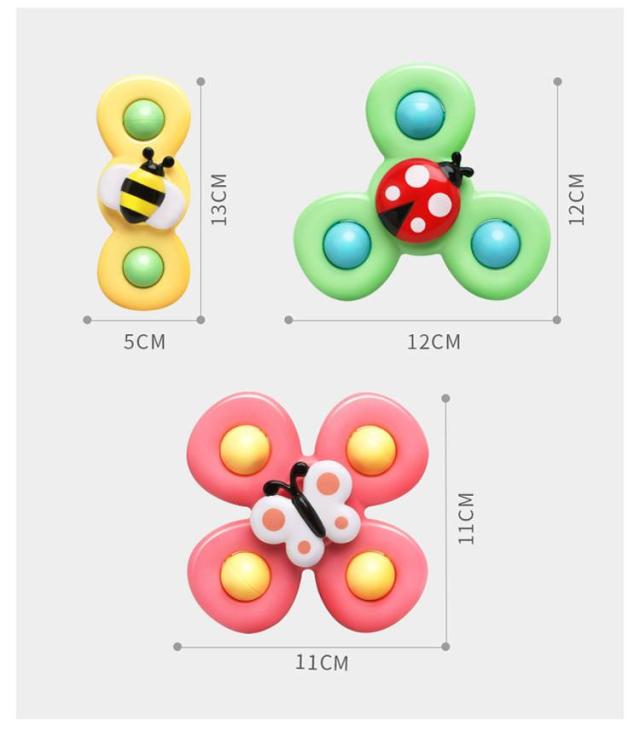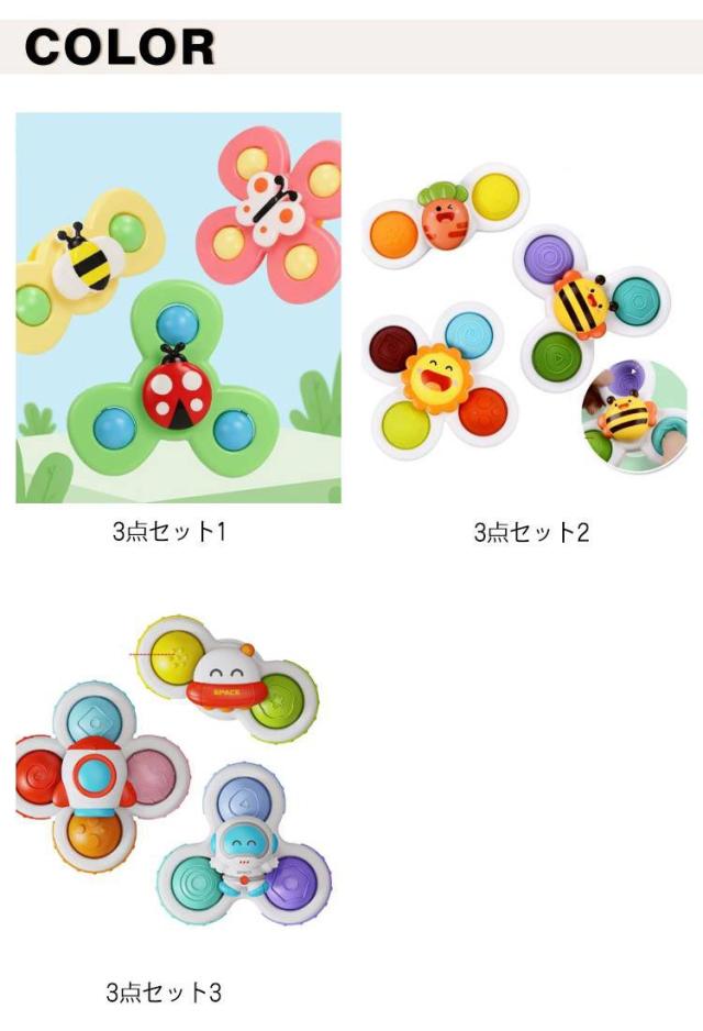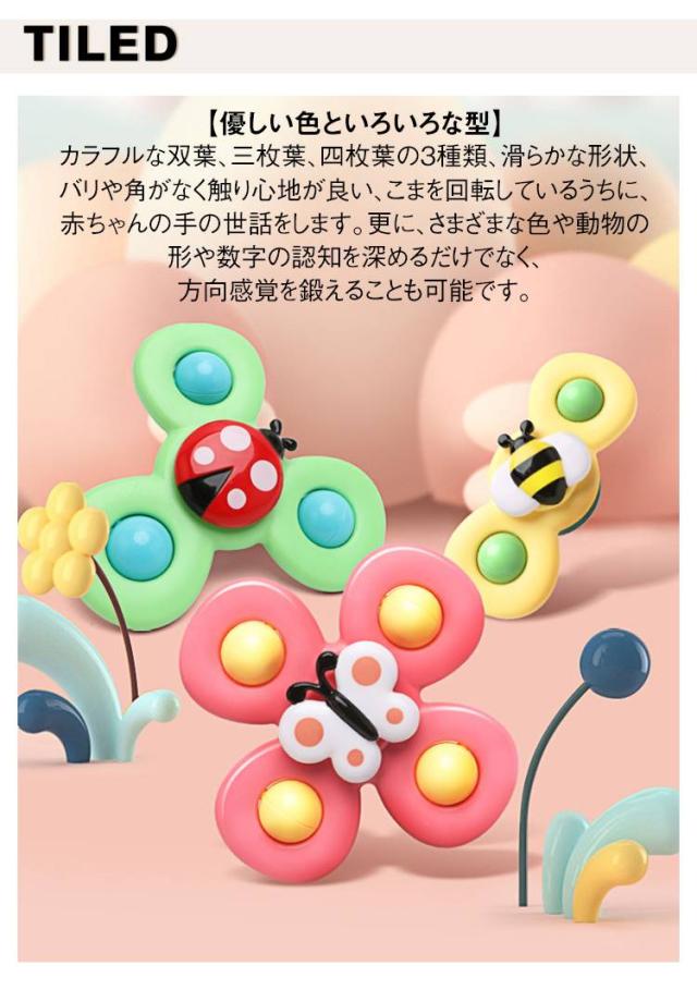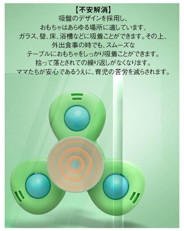 | くるくる回す ハンドスピナー カラフル 3点セット 【優しい色といろいろな型】 カラフルな双葉、三枚葉、四枚葉の3種類、滑らかな形状、バリや角がなく触り心地が良い、こまを回転しているうちに、赤ちゃんの手の世話をします。更に、さまざまな色や動物の形や数字の認知を深めるだけでなく、方向感覚を鍛えることも可能です。 【不安解消】 吸盤のデザインを採用し、おもちゃはあらゆる場所に適しています、ガラス、壁、床、浴槽などに吸着ことができます。その上、外出食事の時でも、スムーズなテーブルにおもちゃをしっかり吸着ことができます。拾って落とされての繰り返しがなくなります。ママたちが安心であるうえに、育児の苦労を減らされます。 【感覚刺激】 楽しみ中の握り、吸着、回転、押す、その他の動きは、赤ちゃんの目と指先の協調を改善し、手の動きを行使するのに役に立ちます。滑らかに長く回り続けるので、赤ちゃんが自分で振って音を出したりして興味を持つことができます。 | |