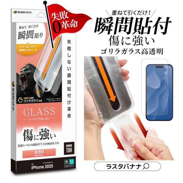 【送料無料】iPhone17 iPhone17 Pro ガラスフィルム 平面保護 高光沢 高透明 クリア ゴリラガラス採用 0.33mm 硬度10H 貼付革命 瞬間貼り 失敗しない瞬間簡単貼り付け レボリューション アイフォン 保護フィルム ラスタバナナ MTK4886IP5A MTK4954IP5B