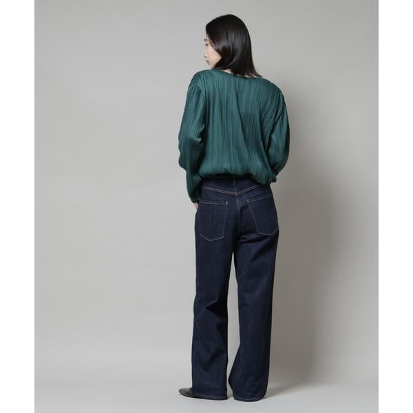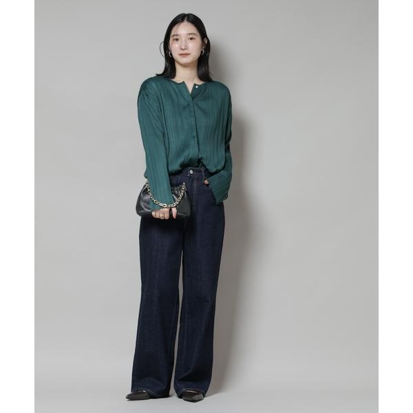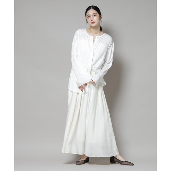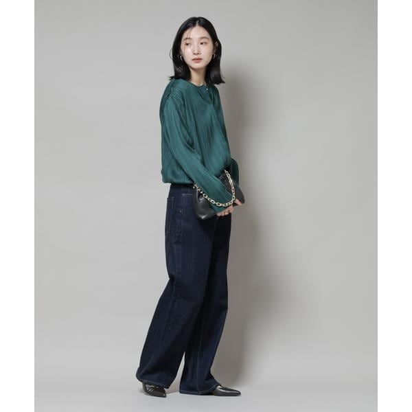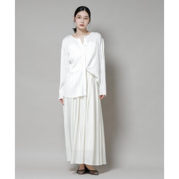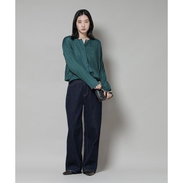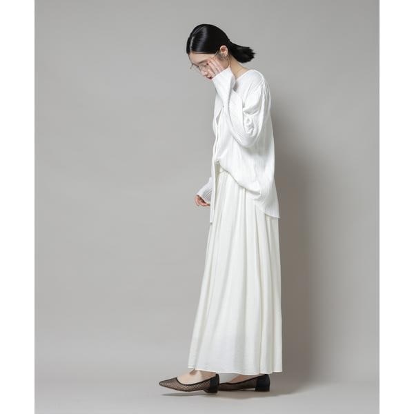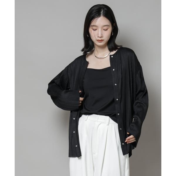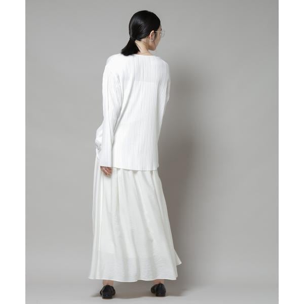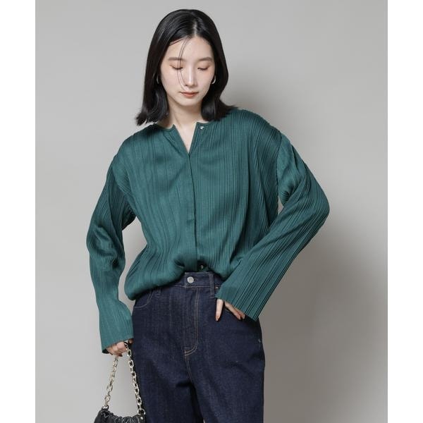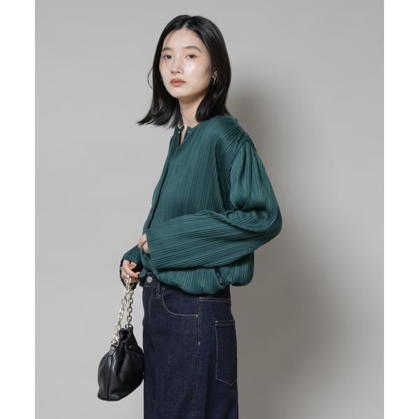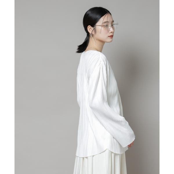 繊細なランダムプリーツが上品で女性らしい印象のカットシャツ。前を閉じてプルオーバーとしても、開けて羽織としても着回し可能で、暑さの残る秋シーズンにも活躍するアイテムです。
