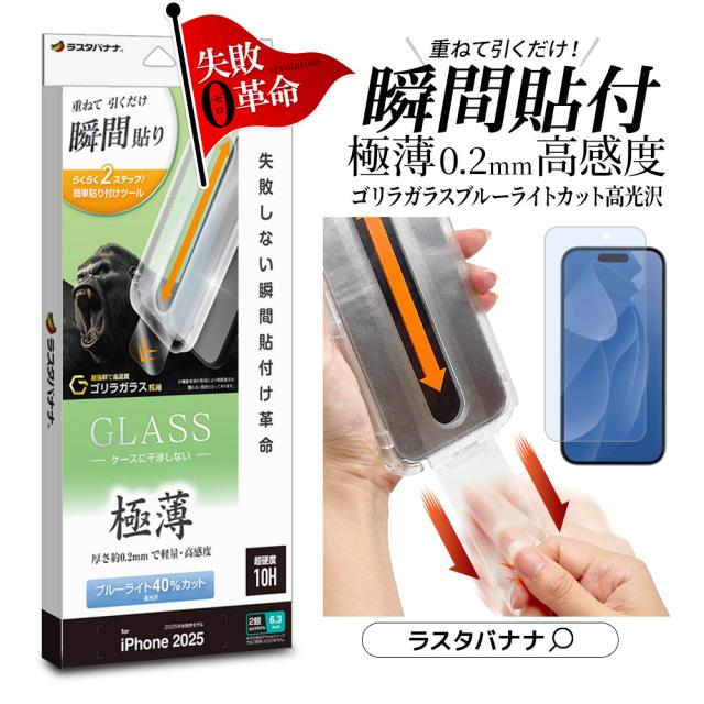 iPhone17 iPhone17 Pro ガラスフィルム 平面保護 ブルーライトカット 高光沢 薄型 高感度 極薄 ゴリラガラス採用 0.2mm 硬度10H 貼付革命 瞬間貼り 瞬間簡単貼り付け レボリューション アイフォン 保護フィルム ラスタバナナ