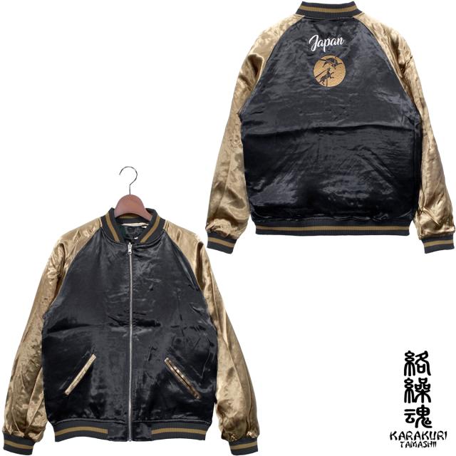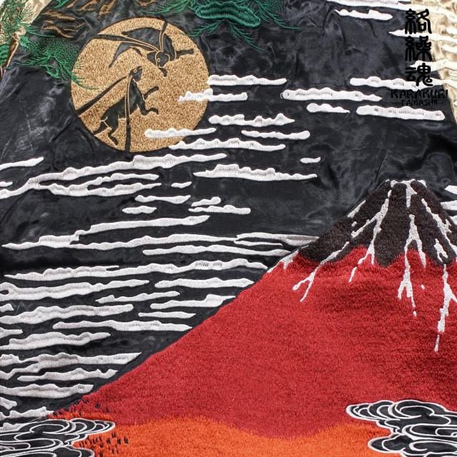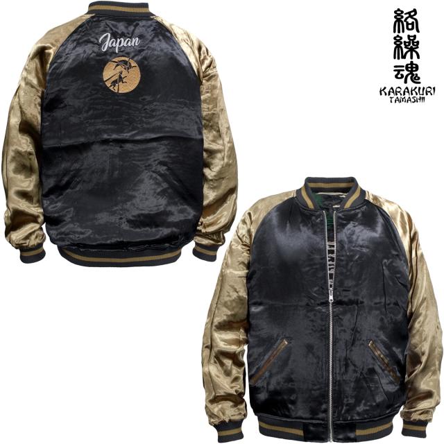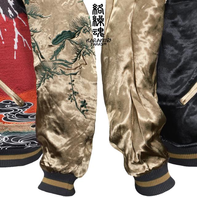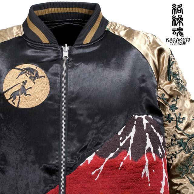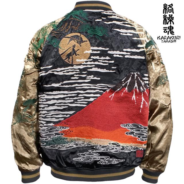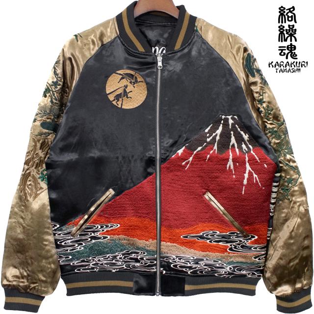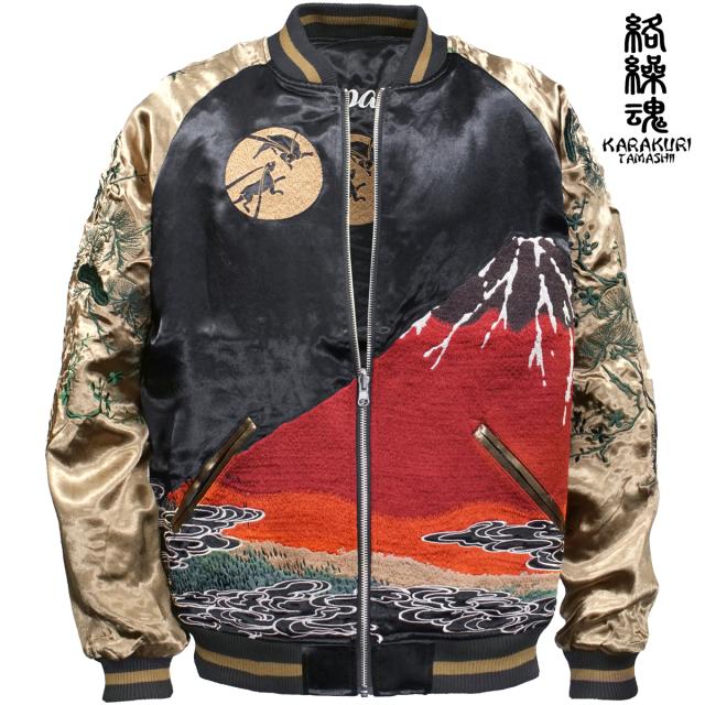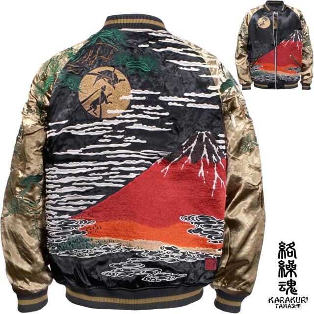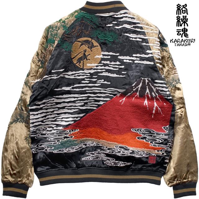 からくり魂 絡繰魂 粋 スカジャン 赤富士 横須賀ジャンパー 和柄 メンズ レディース ユニセックス リバーシブル 刺繍 フルジップ(ブラック黒ゴールド金) 253062