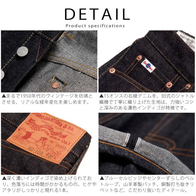■ ステュディオ・ダルチザン STUDIO D'ARTISAN 商品詳細 STUDIO D’ARTISAN(ステュディオ・ダ・ルチザン)の定番デニムシリーズの中でも、長年国内外のジーンズファンから高い支持を集め続けている「SD-103 15ozタイトストレートジーンズ」は、細すぎない絶妙なストレートシルエットと、旧式力織機で織り上げられた15オンスのセルビッチデニムを使用した本格仕様が魅力で、まさに日本製デニムの真骨頂といえる一本です。 生地には防縮加工などを施さない「生機(キバタ)」の状態を採用することで、1950年代のヴィンテージジーンズさながらの自然なねじれやムラ感を楽しめ、濃色インディゴの深みある色合いは穿き込むほどに美しい経年変化を見せ、ヒゲやアタリがしっかりと刻まれていくため、自分だけの色落ちを育てられるのも大きな魅力となっています。 ディテール面でも、銅製リベットやオリジナルの山羊革パッチ、クラシックなボタンフライ、ブルーセルビッチ、センターずらしのベルトループなど、ジーンズ好きにはたまらないこだわりが詰まっており、濃淡の効いた立体的な色落ちを求めるマニアの方から、初めてダルチザンを穿いてみたいというビギナーの方まで幅広くおすすめできる、まさにブランドを代表する定番タイトストレートジーンズです。 日本製ならではの確かな縫製とクラフトマンシップが光る「SD-103」は、世代や国境を超えて愛される一本であり、長年付き合えるジーンズをお探しの方にぜひ手に取っていただきたい逸品です。 |