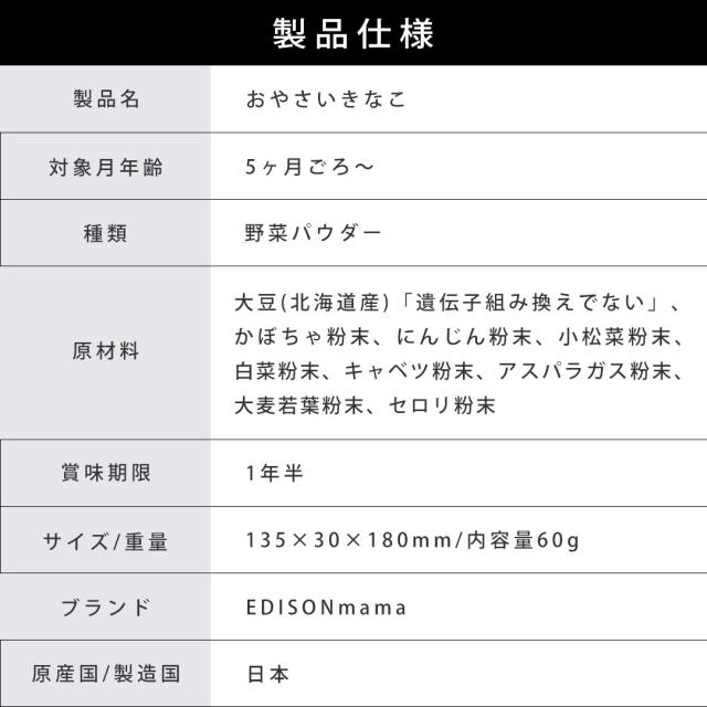 おやさいきなこ 60g NEW 【5個セット】 離乳食 パウダー 砂糖不使用 国産 野菜 やさい 鉄分 たんぱく質 カルシウム 離乳食初期 五ヶ月 粉末 ベビーフード 初期 中期 おやつ グルテンフリー アレルゲン不使用 アレルギー 対応 ベビー 幼児食 エジソン エジソンママ