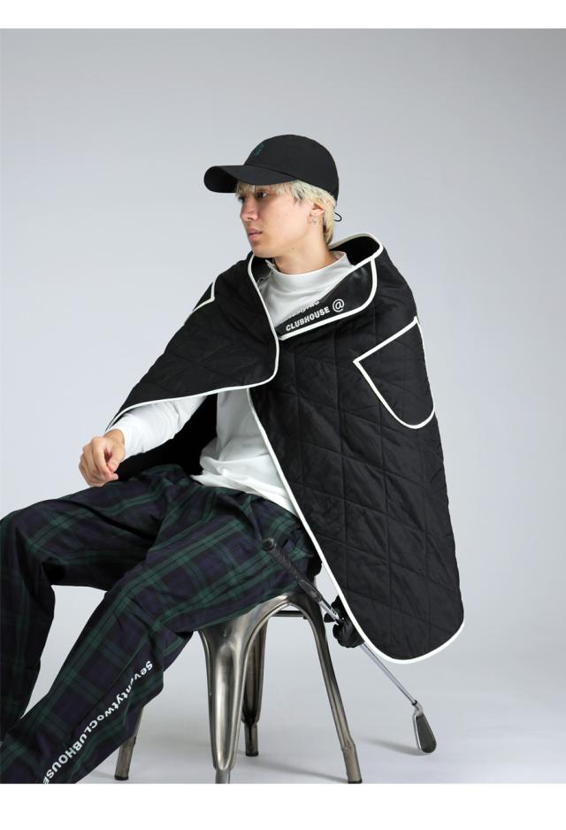 ラウンドや移動時の冷え対策に最適な、裏起毛×キルティングのメンズ向け膝掛けブランケットです。