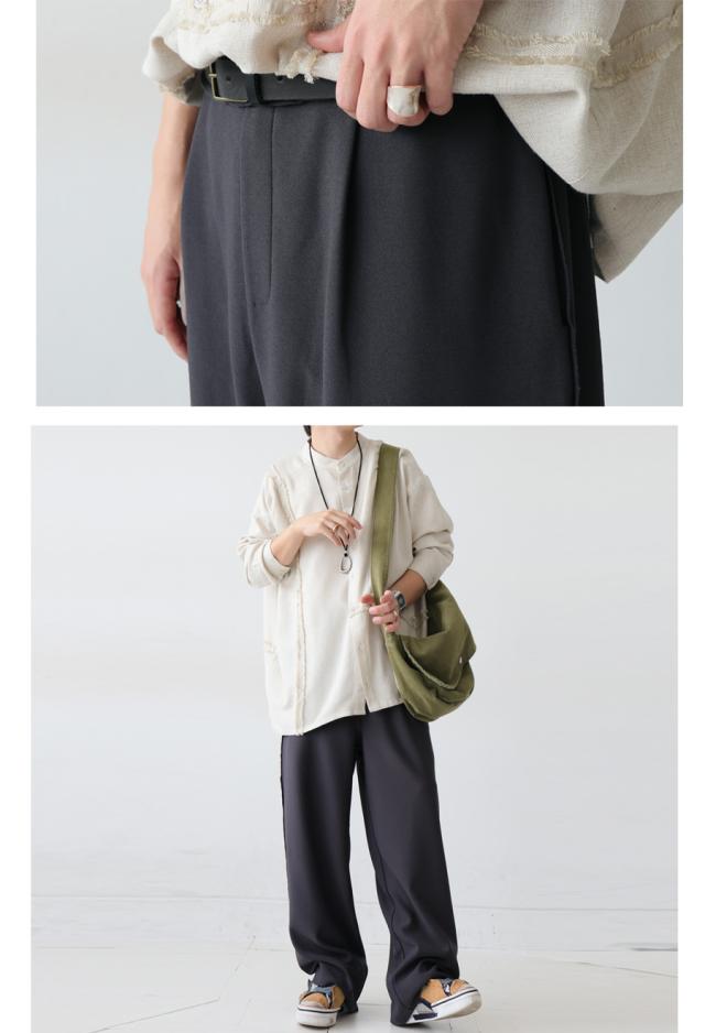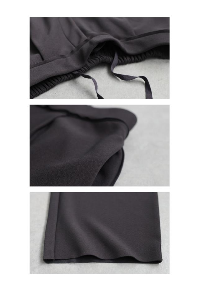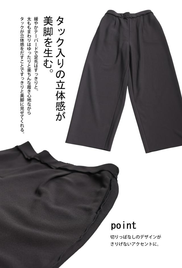 無地デザインとジョーゼット調の上質な質感が洗練された印象を演出し、ワイドすぎないテーパードシルエットが脚のラインをすっきりと見せてくれます。