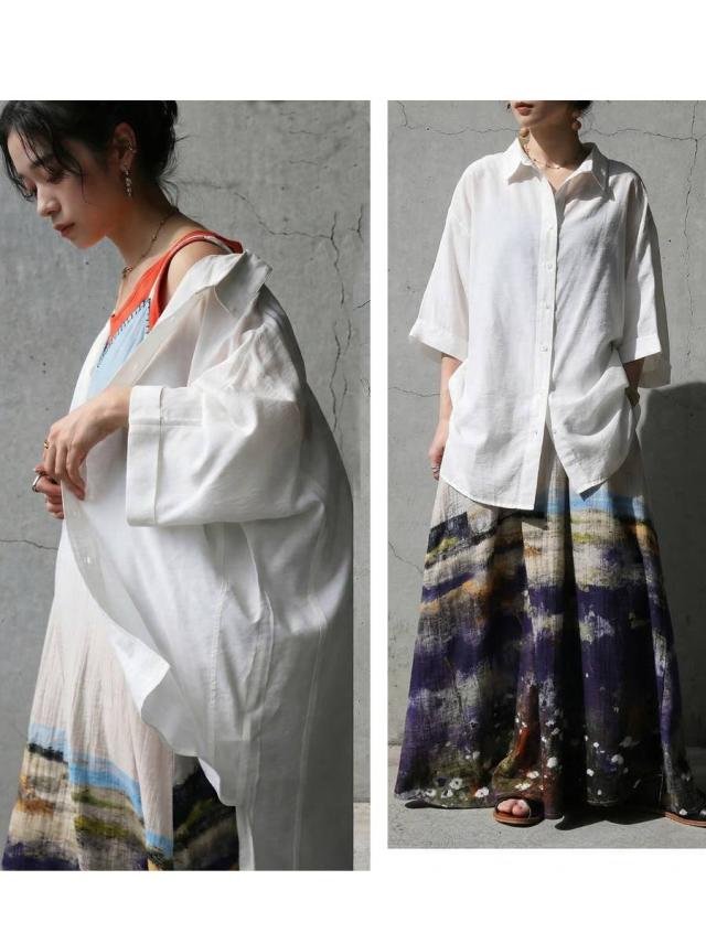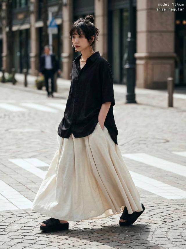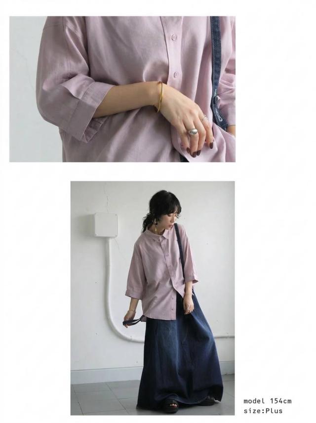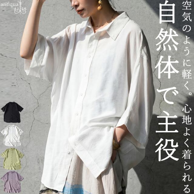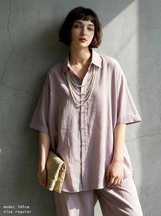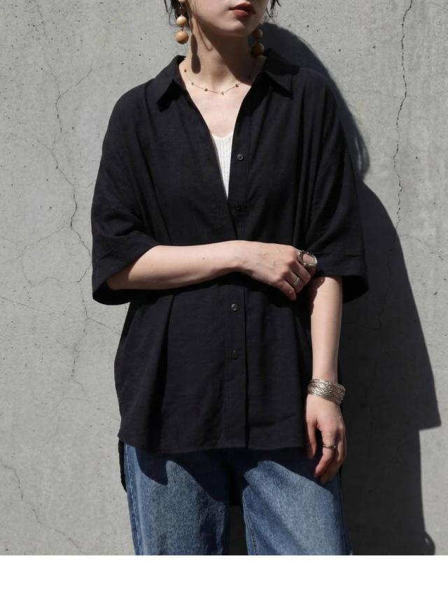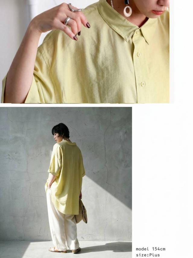 無地で着回し力の高い半袖シャツは、ブラウスとしても使える前開きボタン仕様でデイリーに活躍する一枚です。