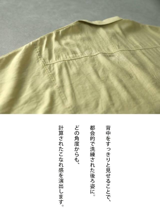 ネックラインはレギュラーカラーで顔周りをすっきり見せ、きれいめとカジュアルを両立します。