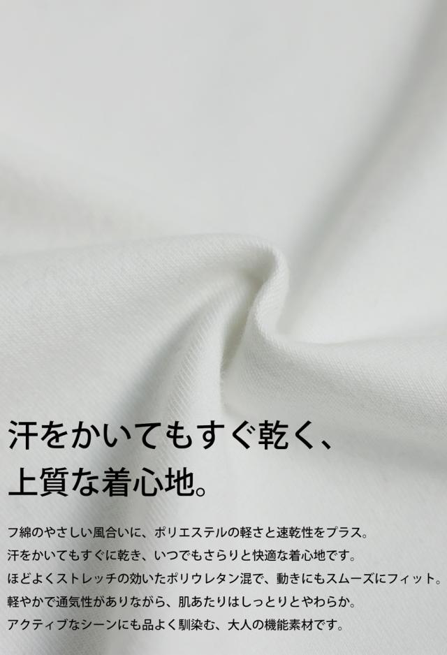 吸汗速乾性に優れたポリエステルと、やわらかな綿(コットン)に加えてポリウレタン(スパン)を含み、軽やかでスムーズな動きに対応します。