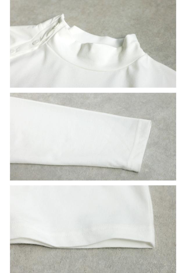 肩に配したボタンディテールがアクセントとなるネックラインは、程よく立ち上がるモックネック仕様。