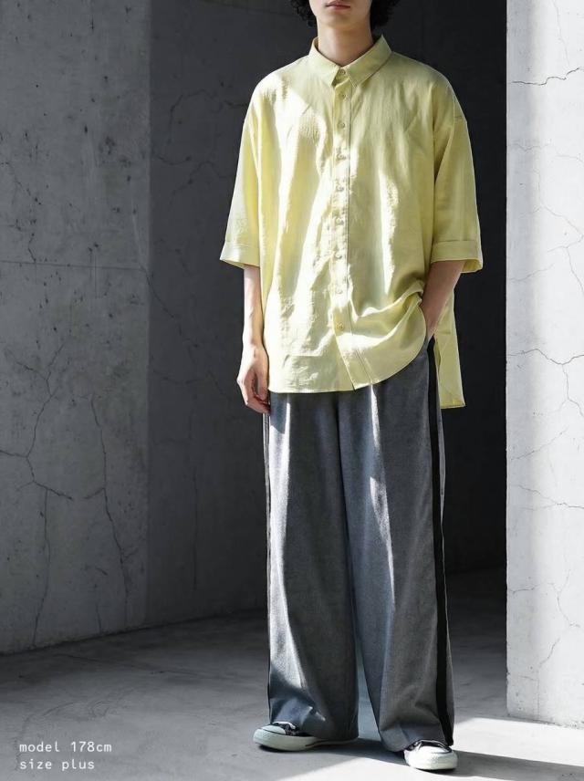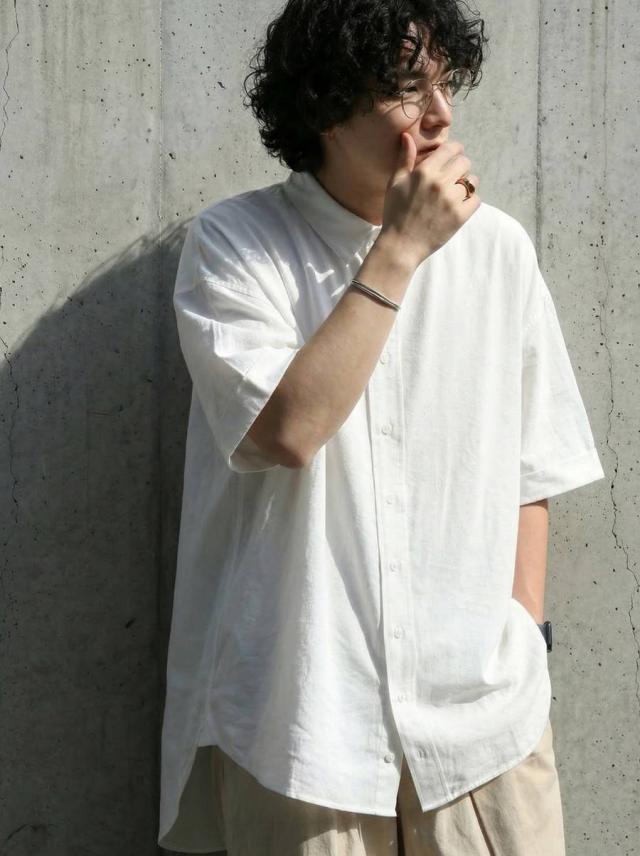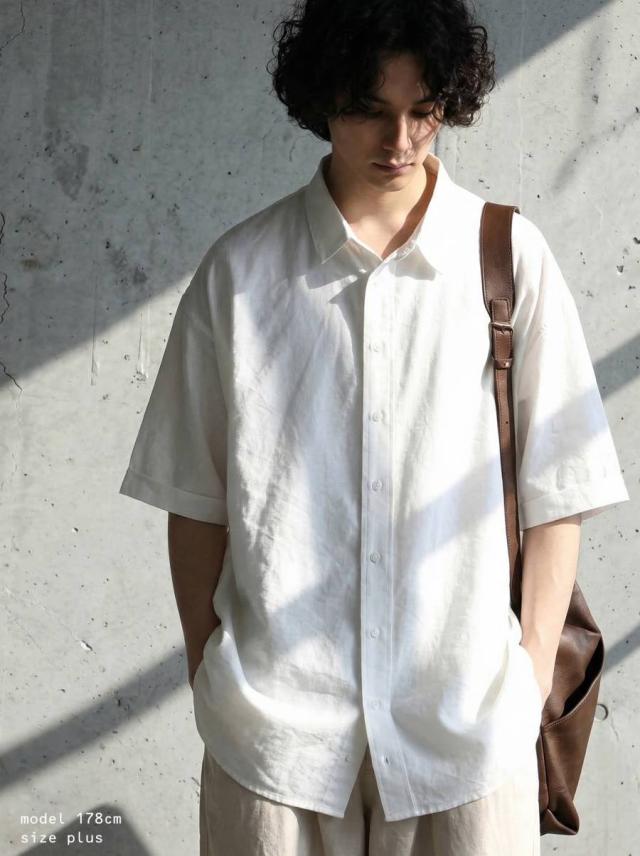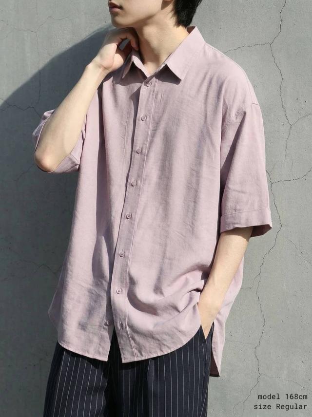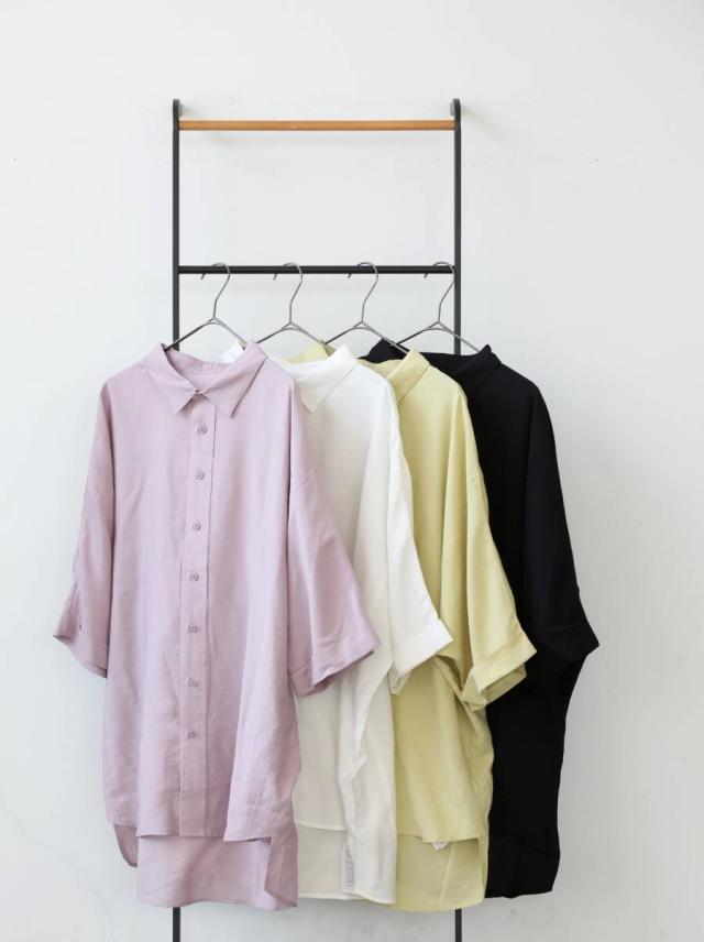 無地で使いやすい半袖シャツはブラウス感覚でも着られる前開きボタン仕様で幅広く活躍します。