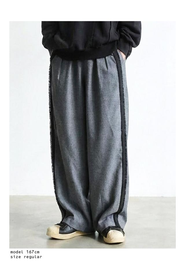 縦のラインを強調するテープデザインが印象的なワイドパンツです。