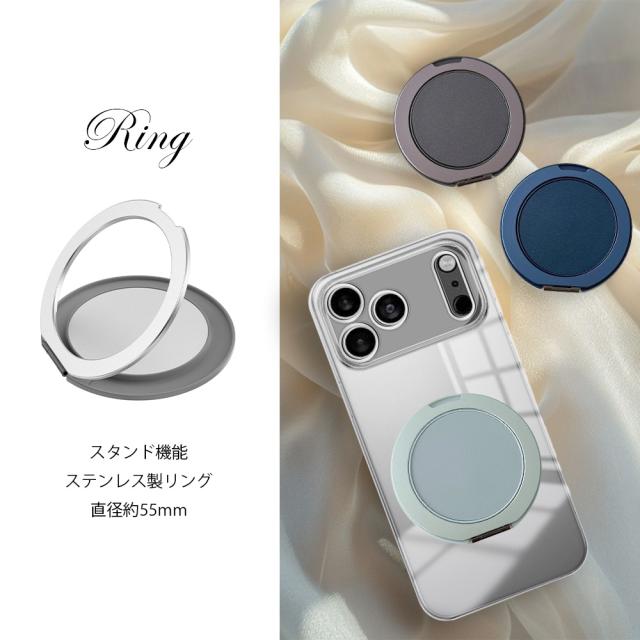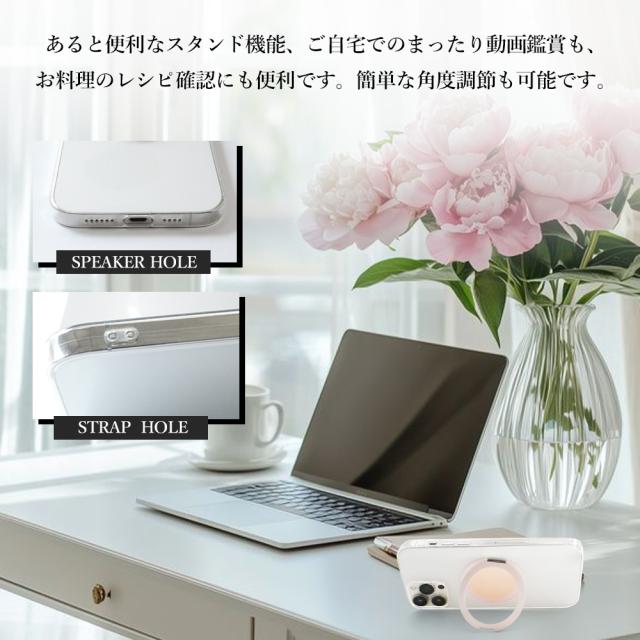 | 特徴 | ・「シンプルかつクリスタルクリア」 スマートフォン本体デザインを損なわず、美しさが際立つスーパークリスタルクリアタイプ。 ・カラー Magsafe対応リングは、鮮やかなメッキ仕上げの6タイプ、お好きなカラーをお選びください!! ・360°回転式スタンド機能付き ケース一体型の収納スタンドは、 360°お好きな位置で停止して使用する事ができます。 収納時もケースにピタッと収まり邪魔になりません。 ・「優れた衝撃吸収性」 ・「適切なアクセスとワイヤレス充電対応」 | ||||||