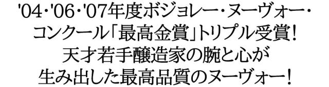![]() パルドン家は1820年より続く家族経営のワイン生産者です。現六代目醸造長エリック・パルドン氏は天才の呼び声高く、彼の作り出すワインは数え切れないメダルの受賞を果たし、賞賛を欲しいままにしております。 ![]() 2004年度にはボジョレー・ヴィラージュ・ヌーヴォー・コンクールでたった2本にしか与えられなかった「特級金賞」を受賞。そして昨年の2006年ヴィンテージで再び最高金賞の栄誉に輝きました。 さらに昨年の2007年も最高金賞を受賞しトリプル受賞の栄誉に輝いています。 ![]() 【受賞実績】パルドン・エ・フィス社のワインは、パリやマコン、ヨーロピアンマスターその他、毎年数々のコンクールでゴールドメダルを受賞しています。2004年と2006年、2007年のボージョレー・ヌーヴォー・コンクールでは「パルドン・エ・フィス社醸造ボージョレー・ヴィラージュ・ヌーヴォー」が金賞のさらに上のランク2本に与えられる“Grande Medaille d’Or”(グランド・メダイユ・ドール)「特級金賞」受賞の栄誉に輝きました。 |