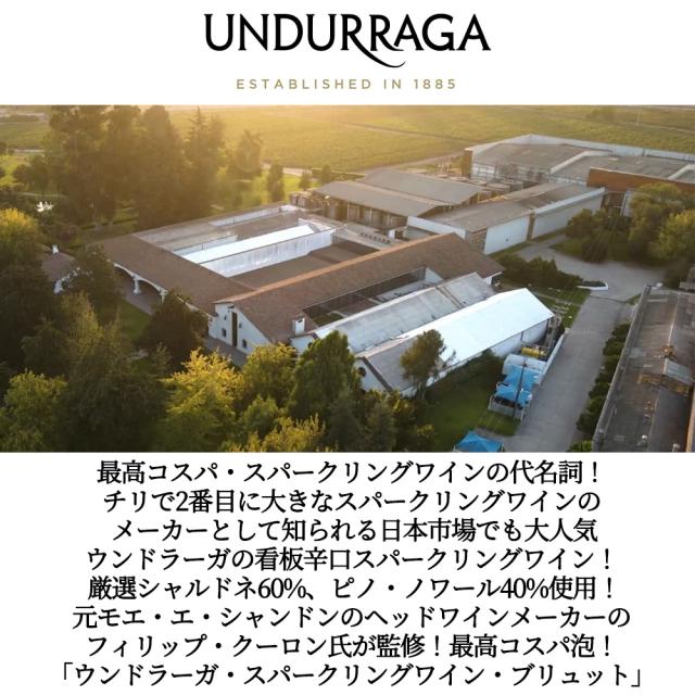 最高コスパ・スパークリングワインの代名詞!チリで2番目に大きなスパークリングワインの メーカーとして知られる日本市場でも大人気ウンドラーガの看板辛口スパークリングワイン! 厳選シャルドネ60%、ピノ・ノワール40%使用!元モエ・エ・シャンドンのヘッドワインメーカーのフィリップ・クーロン氏が監修!最高コスパ泡!「ウンドラーガ・スパークリングワイン・ブリュット」