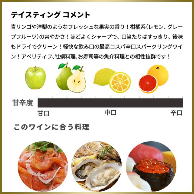 ![]() ■ぶどう品種:シャルドネ60%、ピノ・ノワール40% 最高コスパ・スパークリングワインの代名詞!元モエ・エ・シャンドンのヘッドワインメーカー、フィリップ・クーロン氏が監修!スパークリング・ワインの生産は1950年代に始まり、今日では、伝統製法の中高級レンジをはじめ、プレミアムスパークリングメーカーとして、またチリで2番目に大きなスパークリングワインのメーカーとして知られる日本市場でも大人気ウンドラーガの柑橘系アロマが溢れ出す看板スパークリングワイン! 輝きのある淡い黄色!きめ細かく持続性のある泡!青リンゴや洋梨のようなフレッシュな果実の香り!柑橘系(レモン、グレープフルーツ)の爽やかさ!ほどよくシャープで、口当たりはすっきり、後味もドライでクリーン!軽快な飲み口の最高コスパ辛口スパークリングワイン!アペリティフ、牡蠣料理、お寿司等の魚介料理との相性抜群です! |