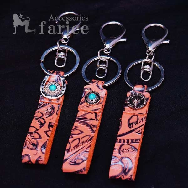 ベージュ レザー 合皮 植物柄 メタル 紋章 メンズ カニカン 大きめ フック キーホルダー 【馬蹄/サークル/水牛】