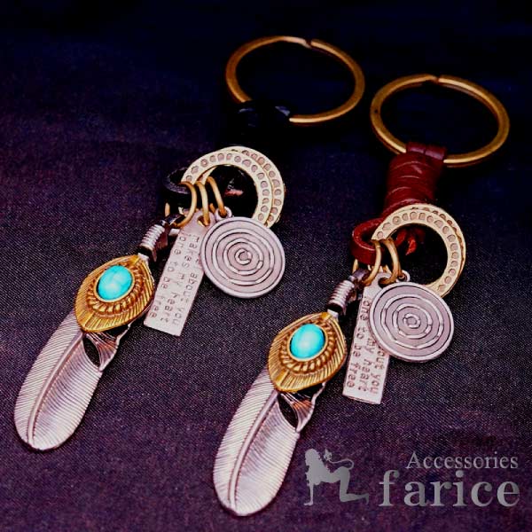 皮 レザー 羽根 フェザー ターコイズ 渋い 重ね付け 燻し メンズ キーホルダー キーリング 【ブラック/ブラウン】