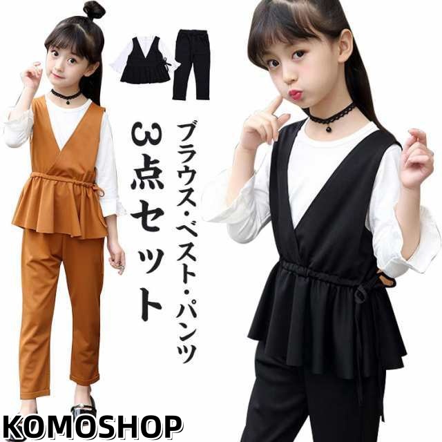 | ブラウス・ベスト・パンツ 3点セット。上質で高級感溢れるすごくかわいい女の子フォーマルセットアップです。 可愛くて着まわしやすい、コットン素材を使用して、柔らかくて肌触りが良いのも魅力! ストレッチ素材だから動きやすいのが嬉しい! 普段着、通学、通園、お出かけはもちろん、入園式や卒園式、入学式、お誕生日、パーティー、結婚式、七五三、お受験、発表会など長いシーズン、様々なシーンでご活用いただける1着です。 | |