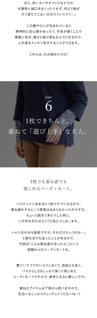 ・腕まくりが要らず、手首が覗いて軽さと抜け感を作る七分袖。