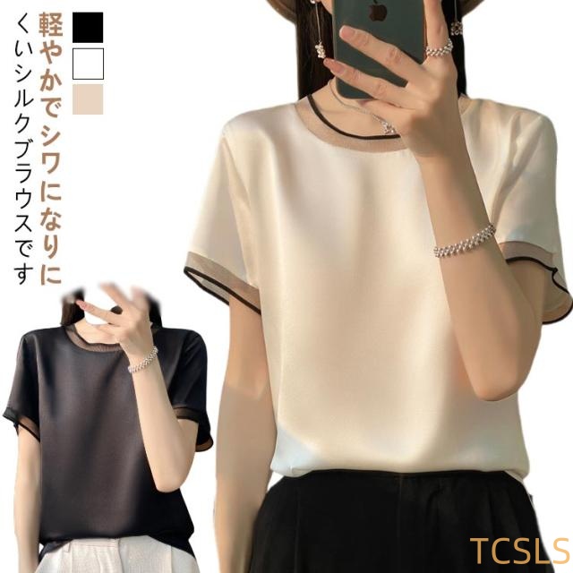 シャツ シルク ブラウス 半袖 レディース 夏 tシャツ サテン プルオーバー Uネック シャツブラウス トップス 体型カバー インナー 大きいサイズ 薄手 レース 吸湿 速乾 敏感肌 光沢感 透けない 肌着 大人 きれいめ 切り替え 高品質 肌に優しい 上品 黒 白 ホワイト ブラック
