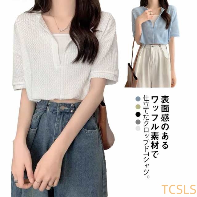クロップドTシャツ レディース 重ね着風 半袖Tシャツ ショート丈 へそ出し トップス カットソー Tシャツ クロップド丈 半袖 Vネック ワッフル フェイクレイヤード クロップドシャツ 春 夏 20代 30代 40代 グリーン グレー ホワイト ブラック ブルー