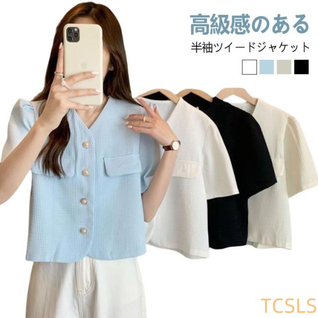 半袖ジャケット レディース ツイード風 アウター 夏 ショート丈 ノーカラー 半袖 サマージャケット クロップド丈 韓国風 無地 お出かけ 着回し お出かけ カジュアル きれいめ 可愛い OL デイリー 結婚式 お呼ばれ