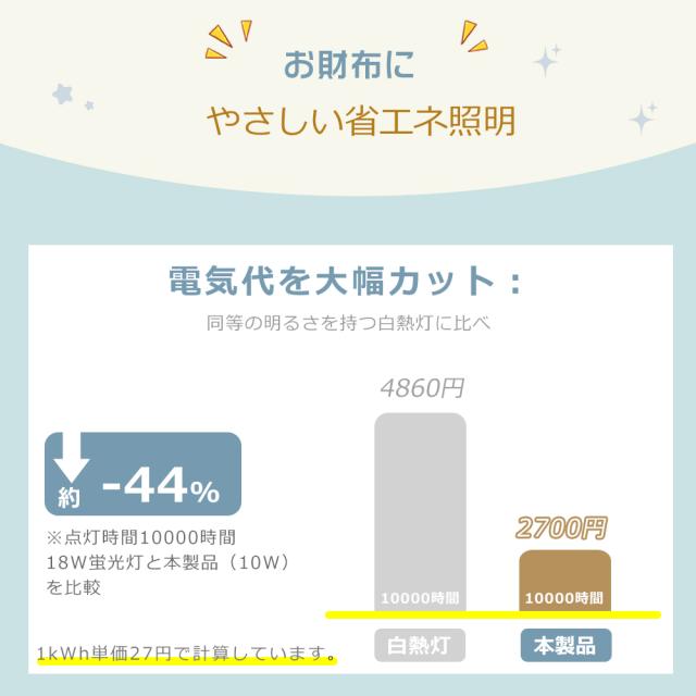★約50,000時間の長寿命。蛍光灯の約4〜8倍も長持ちするため、交換の手間を大幅に削減できます。さらに低消費電力設計により電力消費を抑え、電気代の節約にも貢献します。