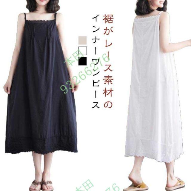 綿 ワンピース インナーワンピース コットン ペチコート 裾レース ぺチワンピース ロング丈 ギャザー インナー ノースリーブ ロングワンピース 重ね